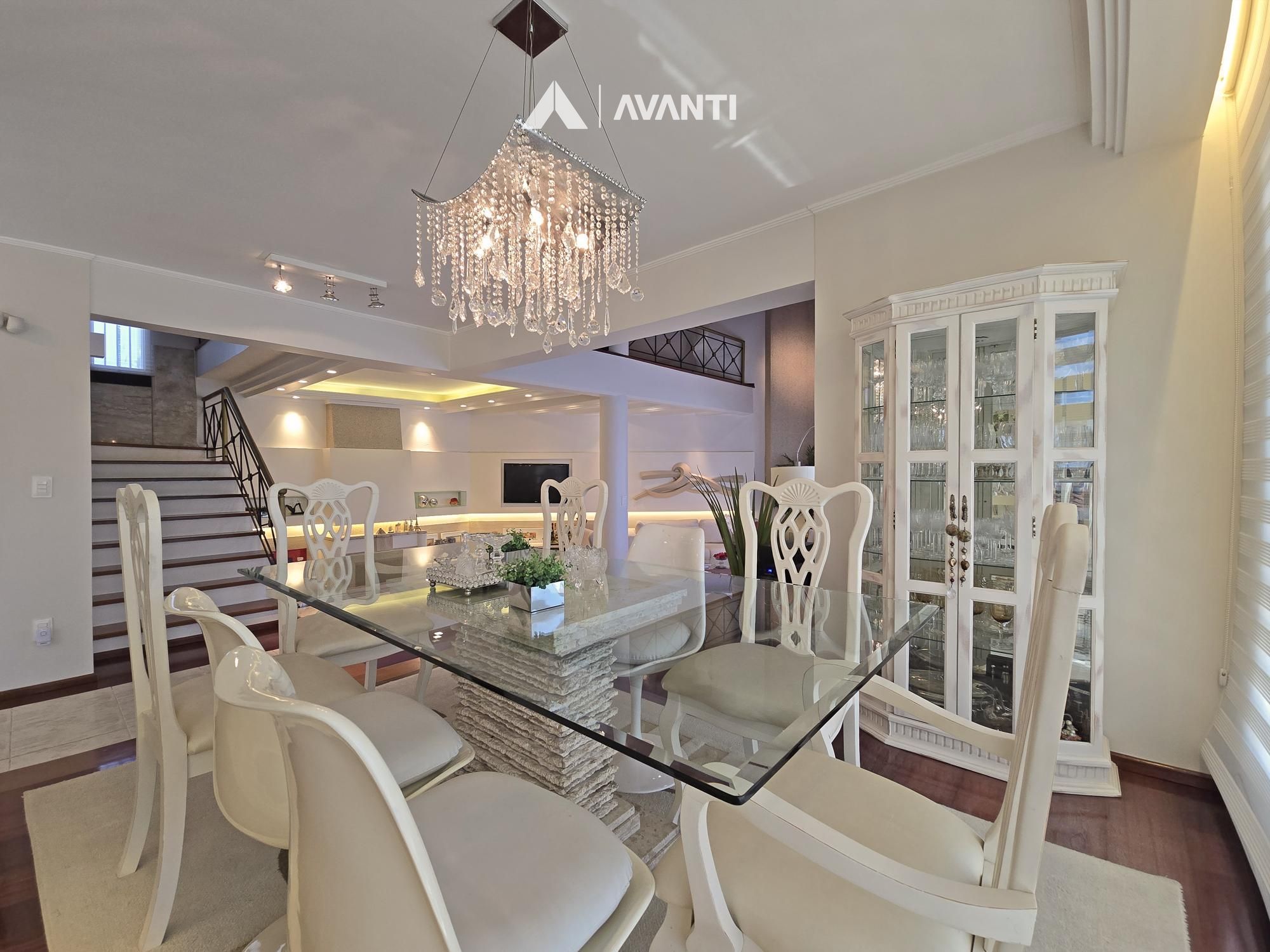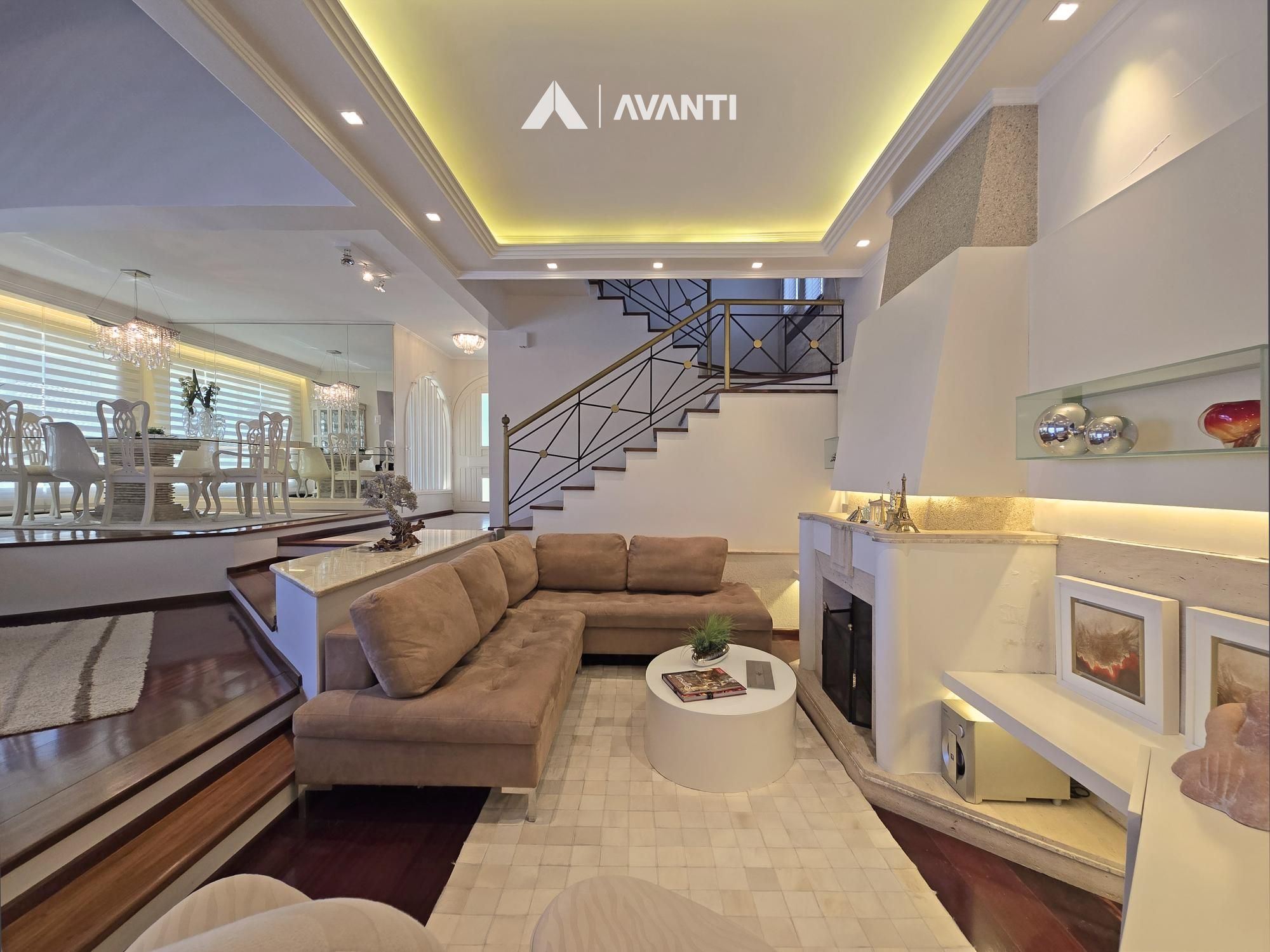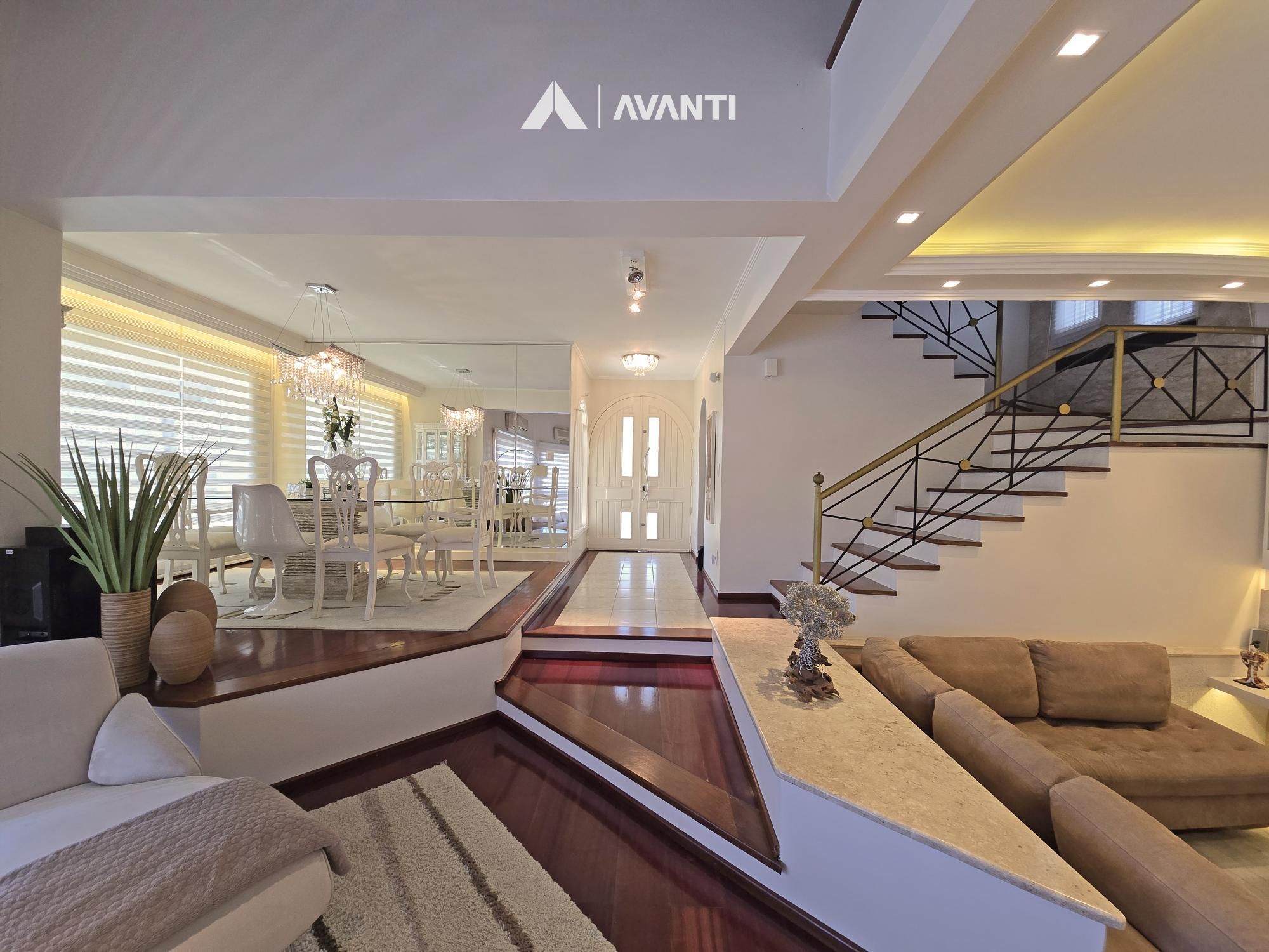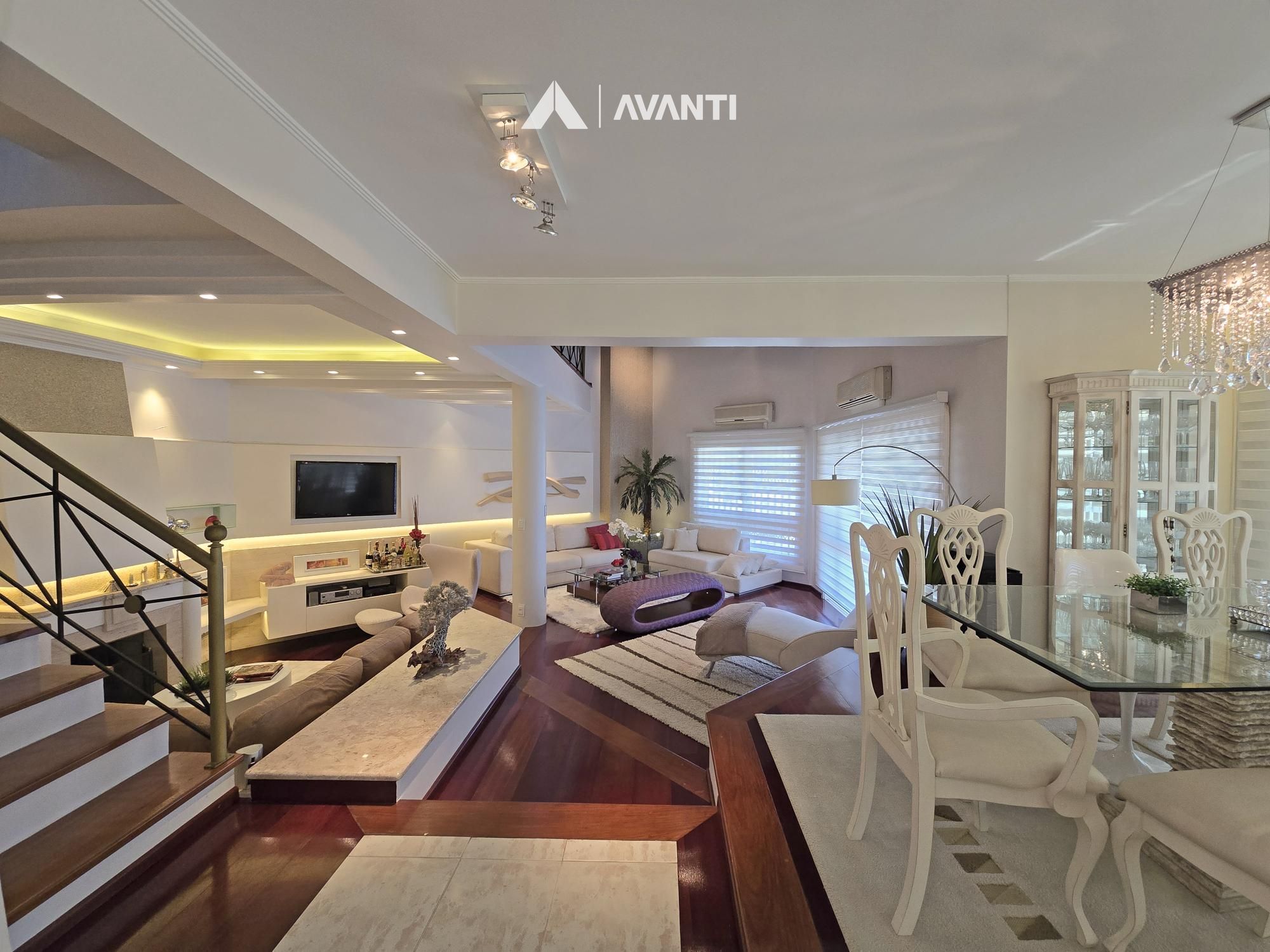Edificada em terreno de 360m², dispõe de 380m² privativos, hall de entrada com lavabo, amplo living com pé direito duplo, sala de estar 3 ambientes com lareira e sacada, sala de jantar, mezanino com sala TV, cozinha copa, área de serviço com dependência, banheiro auxiliar e sacada terraço auxiliar.