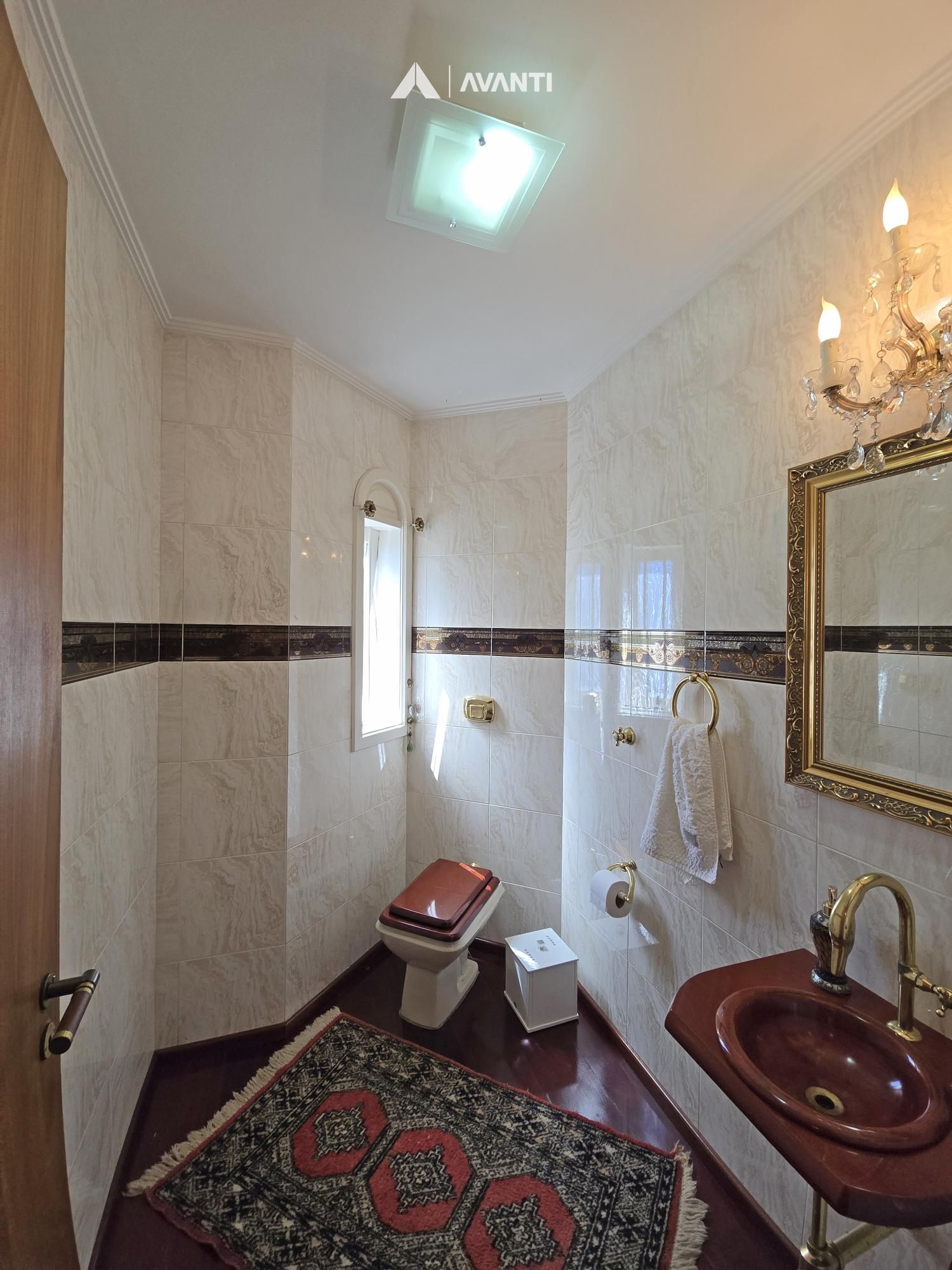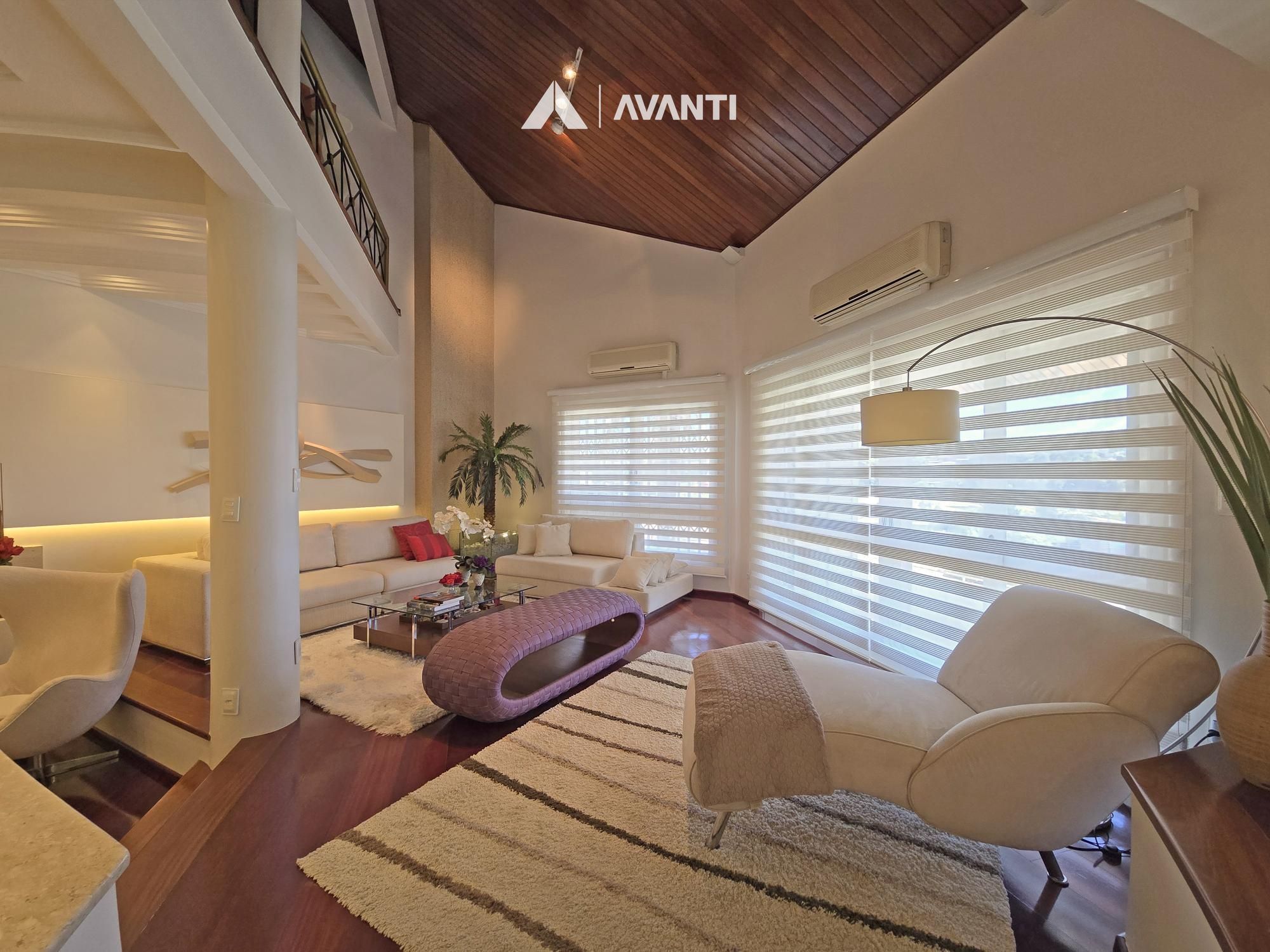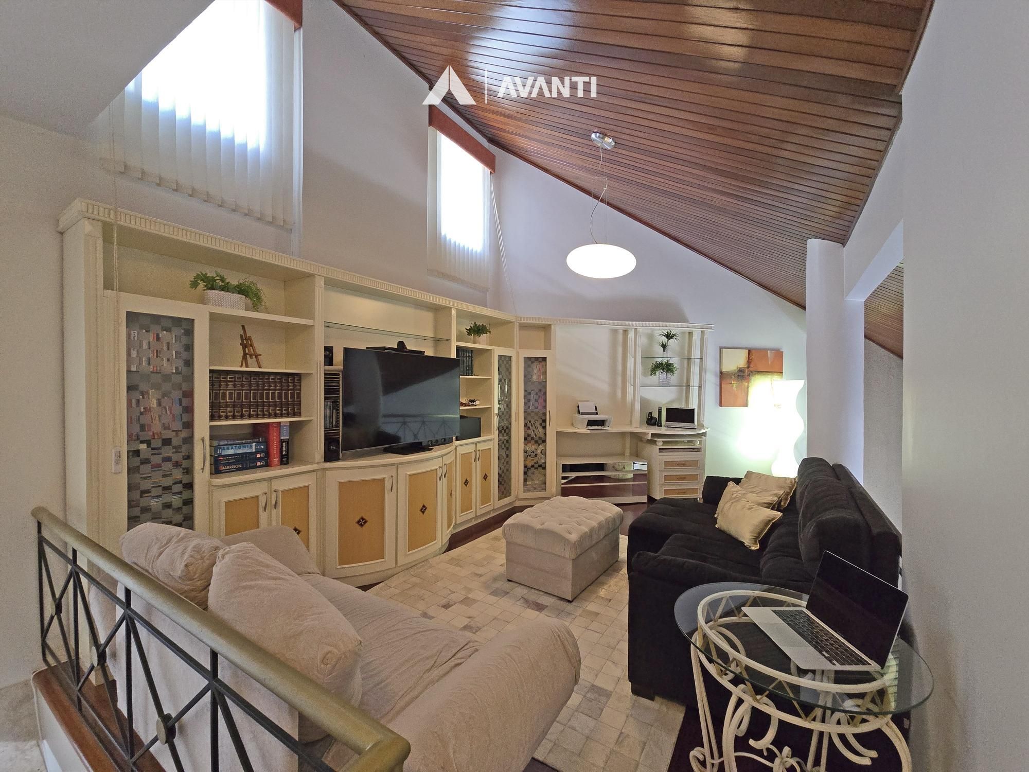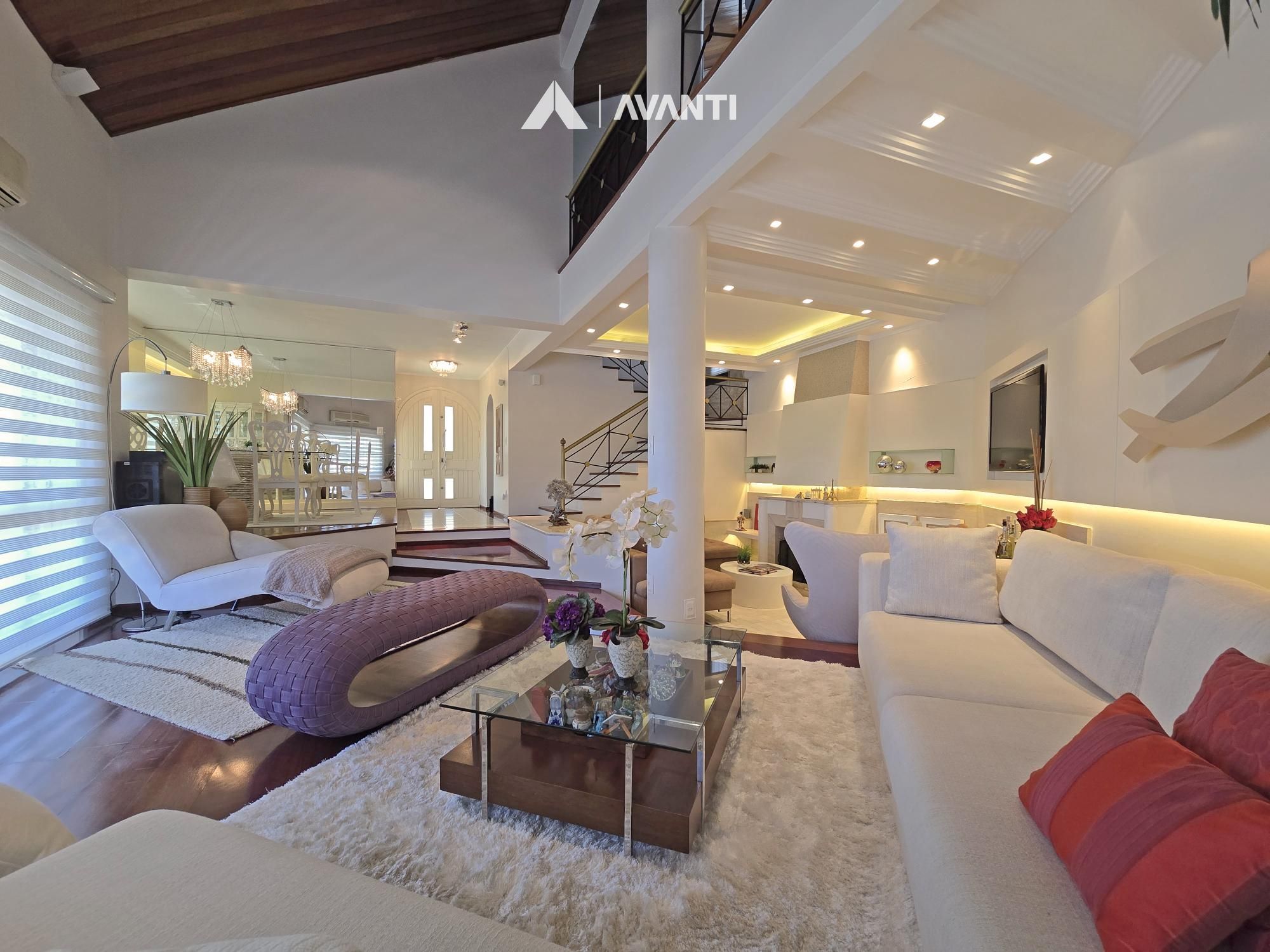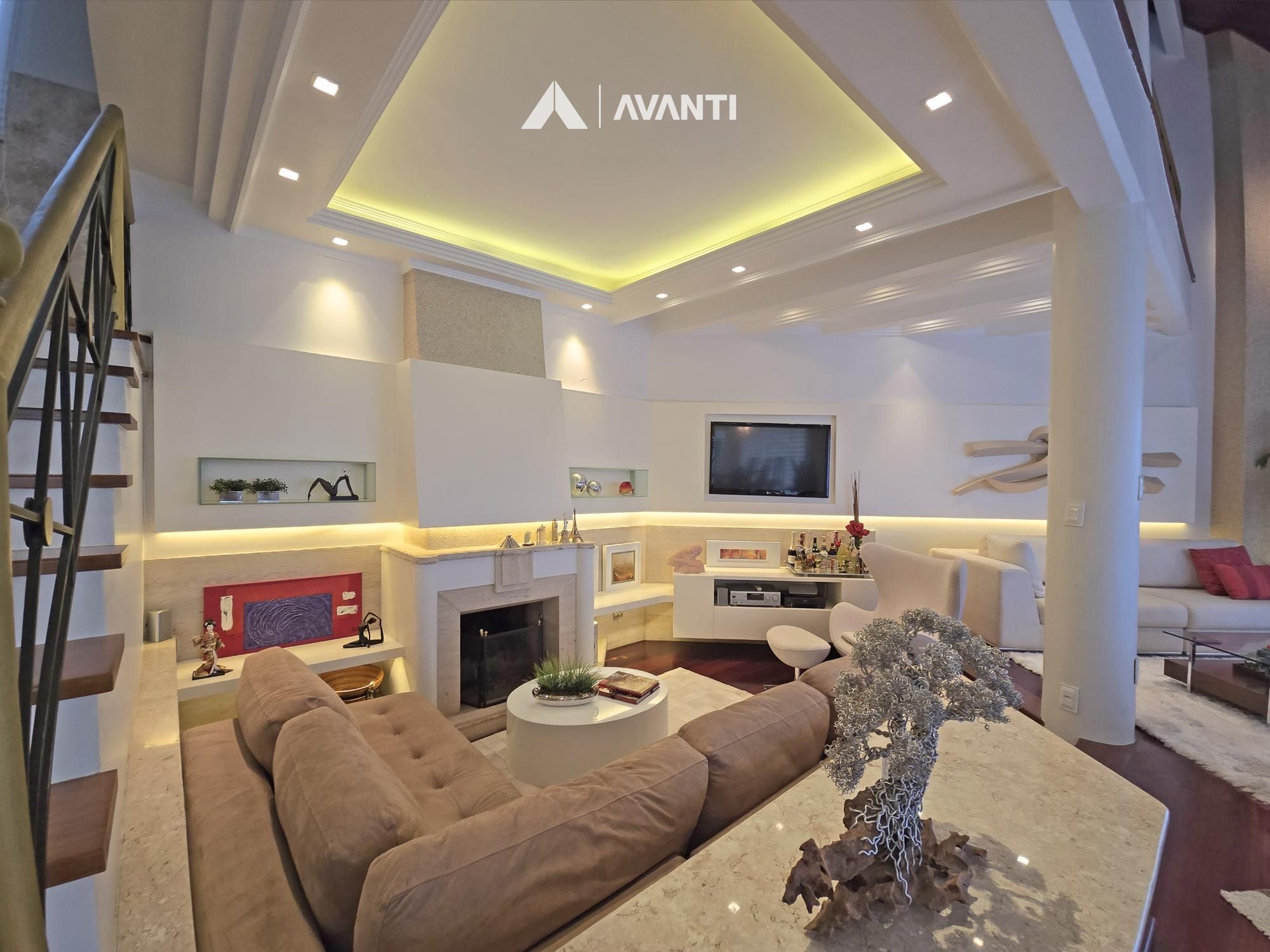 Edificada em terreno de 360m², dispõe de 380m² privativos, hall de entrada com lavabo, amplo living com pé direito duplo, sala de estar 3 ambientes com lareira e sacada, sala de jantar, mezanino com sala TV, cozinha copa, área de serviço com dependência, banheiro auxiliar e sacada terraço auxiliar.