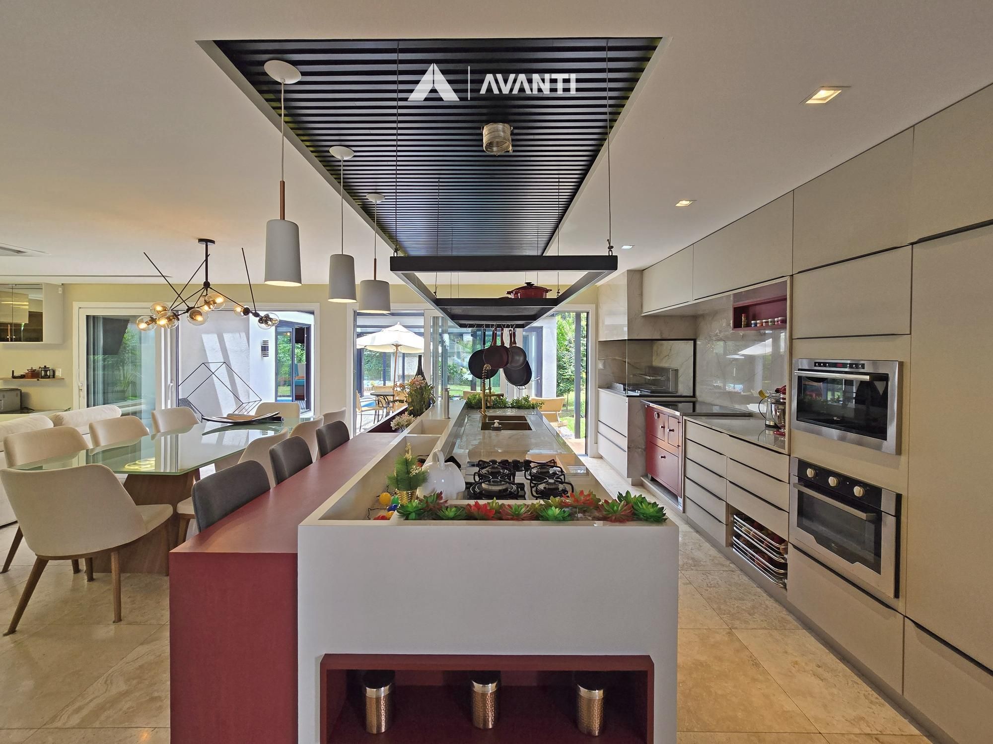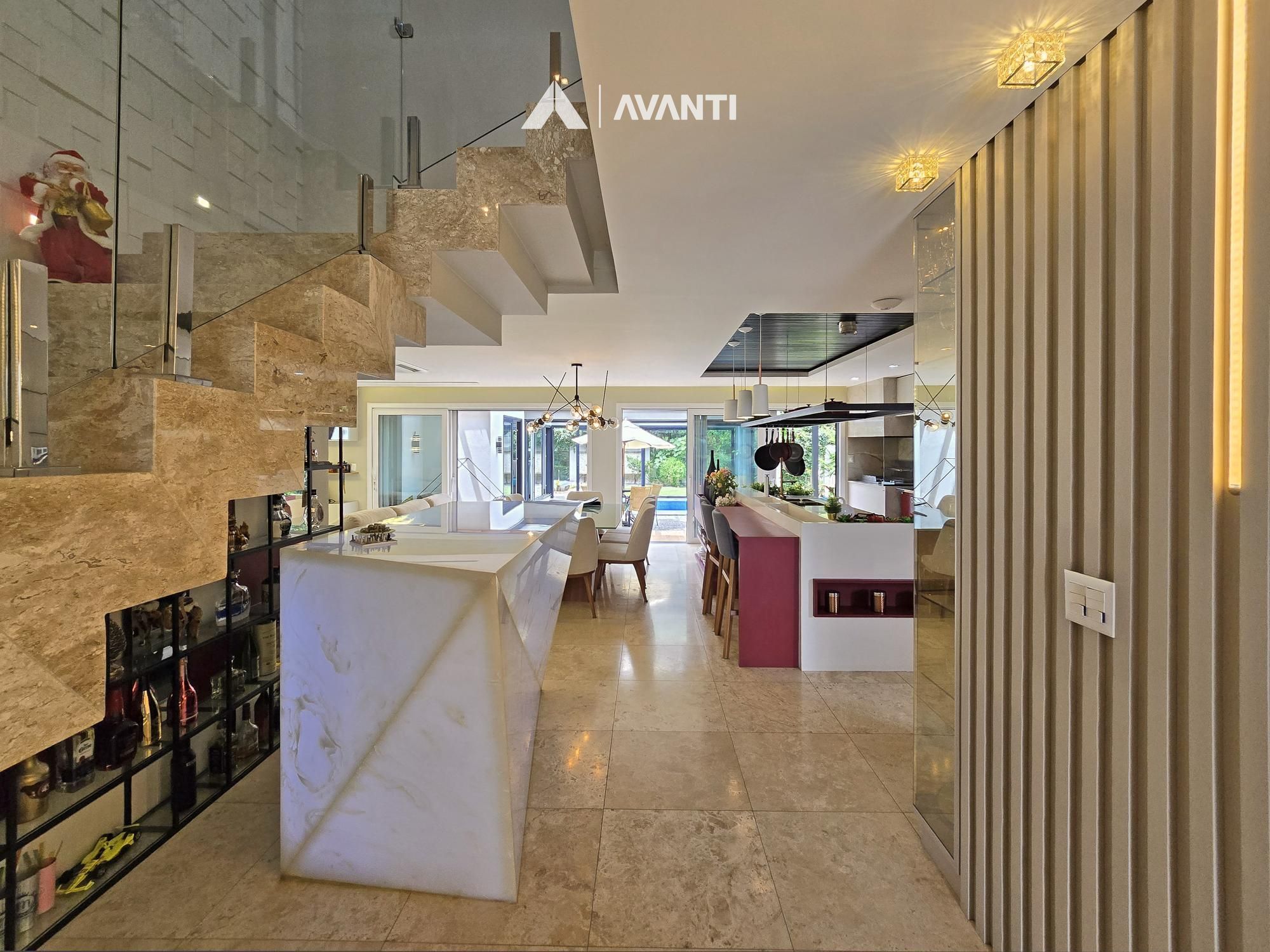 O projeto foi pensado para o equilíbrio energético, com elementos de Feng Shui, e conta com ambientes sofisticados como cinema acústico, escritório, living amplo, bar em Silestone translúcido e escada de mármore personalizada. Todas as esquadrias de PVC bicolor e portas elevadoras garantem isolamento térmico e eficiência energética.