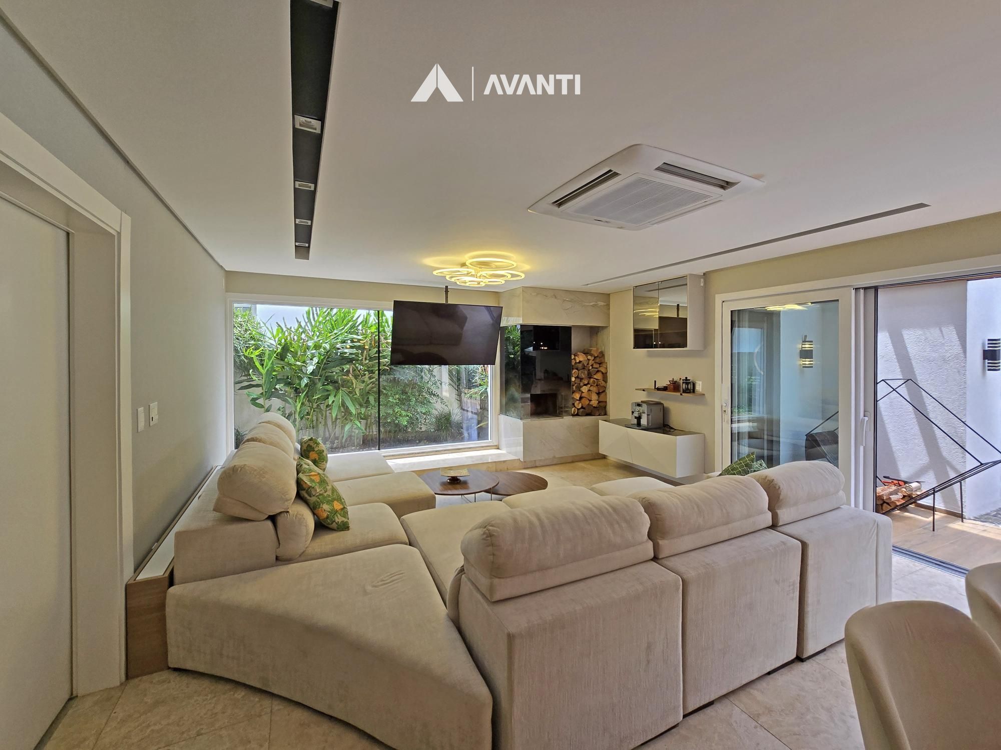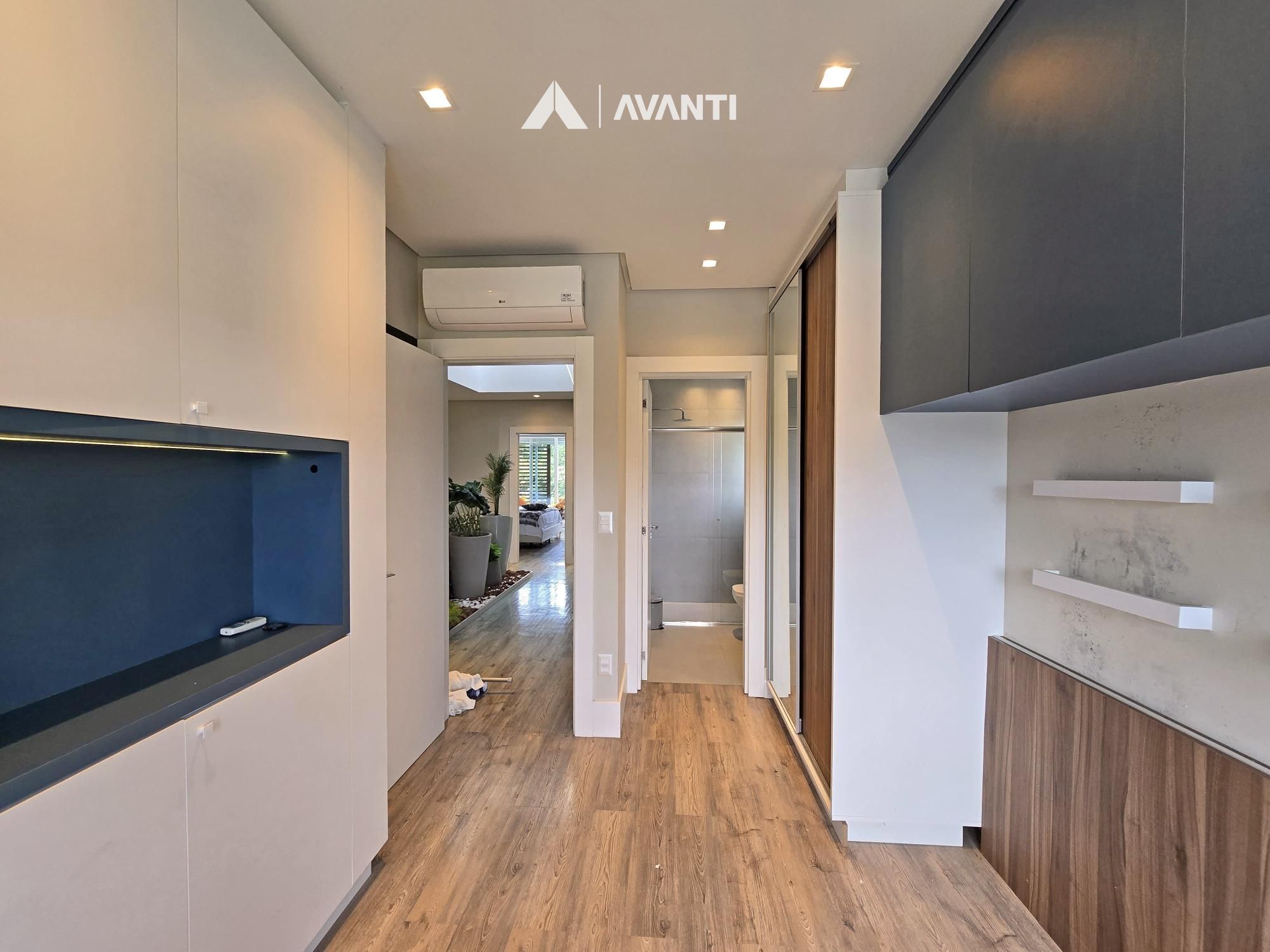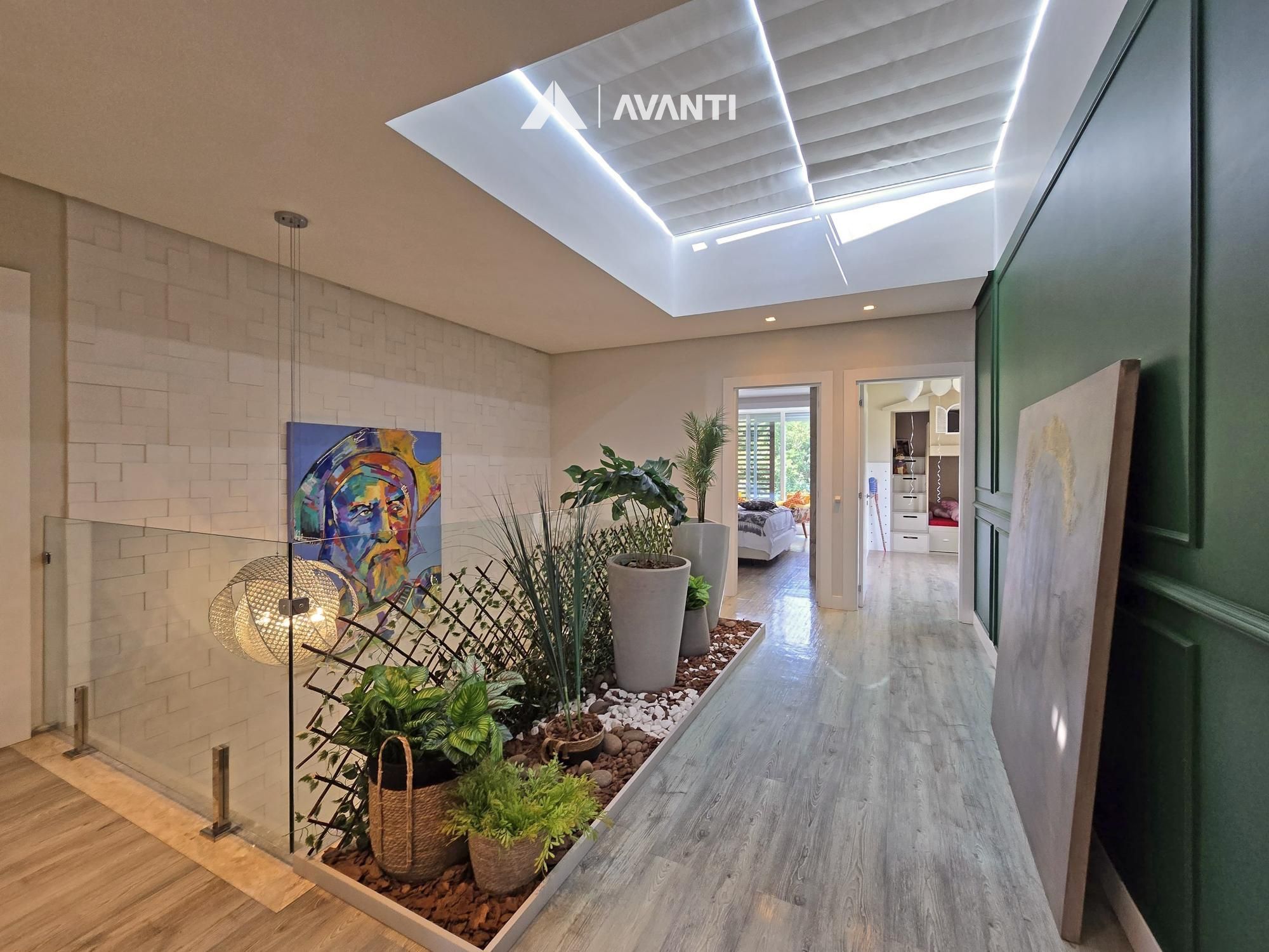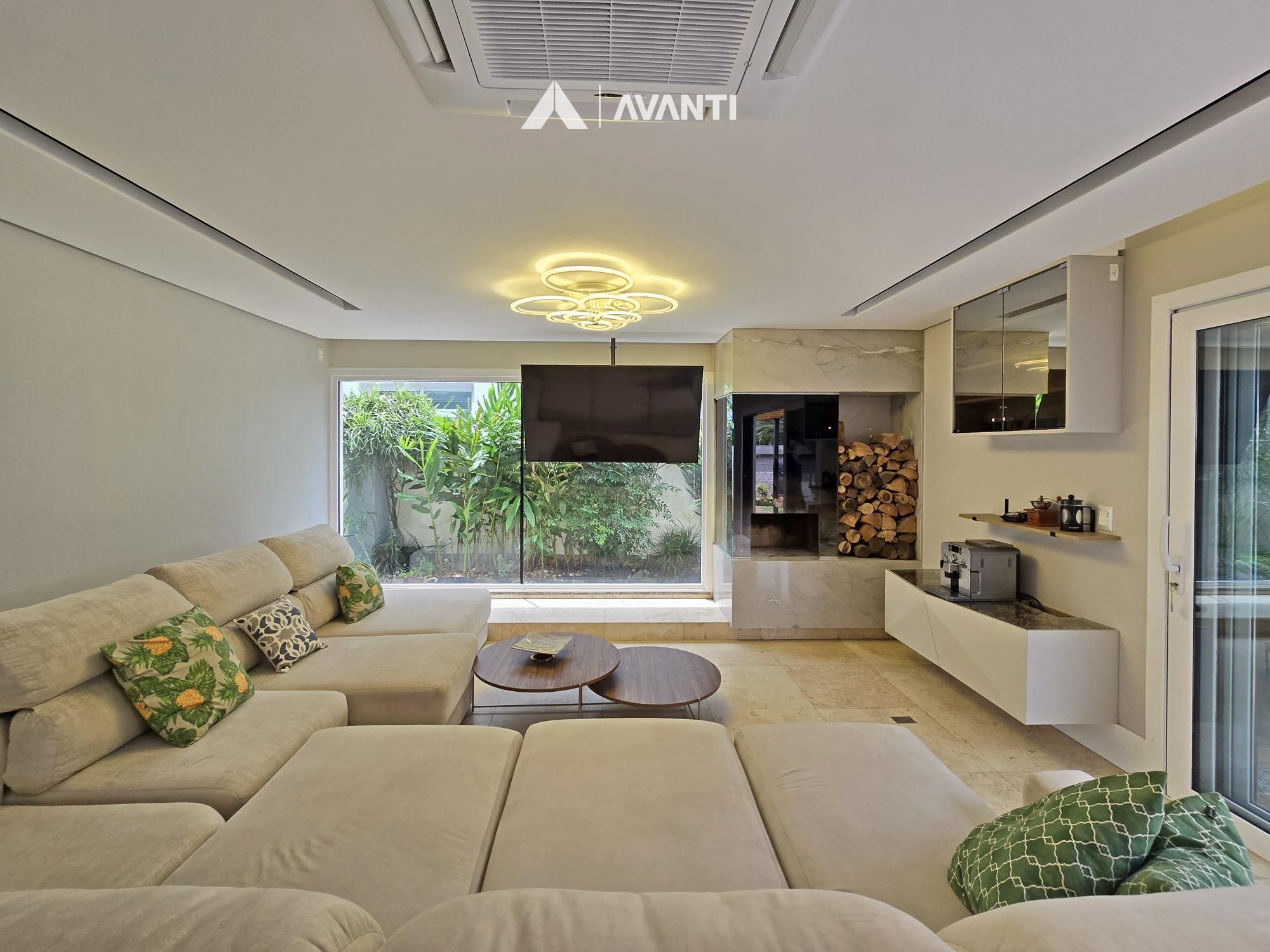 Além disso, a casa oferece conforto total com ar-condicionado em todos os cômodos, sistema de aquecimento de piso, e amplo jardim com árvores frutíferas e decorativas, projeto de Toni Backes.