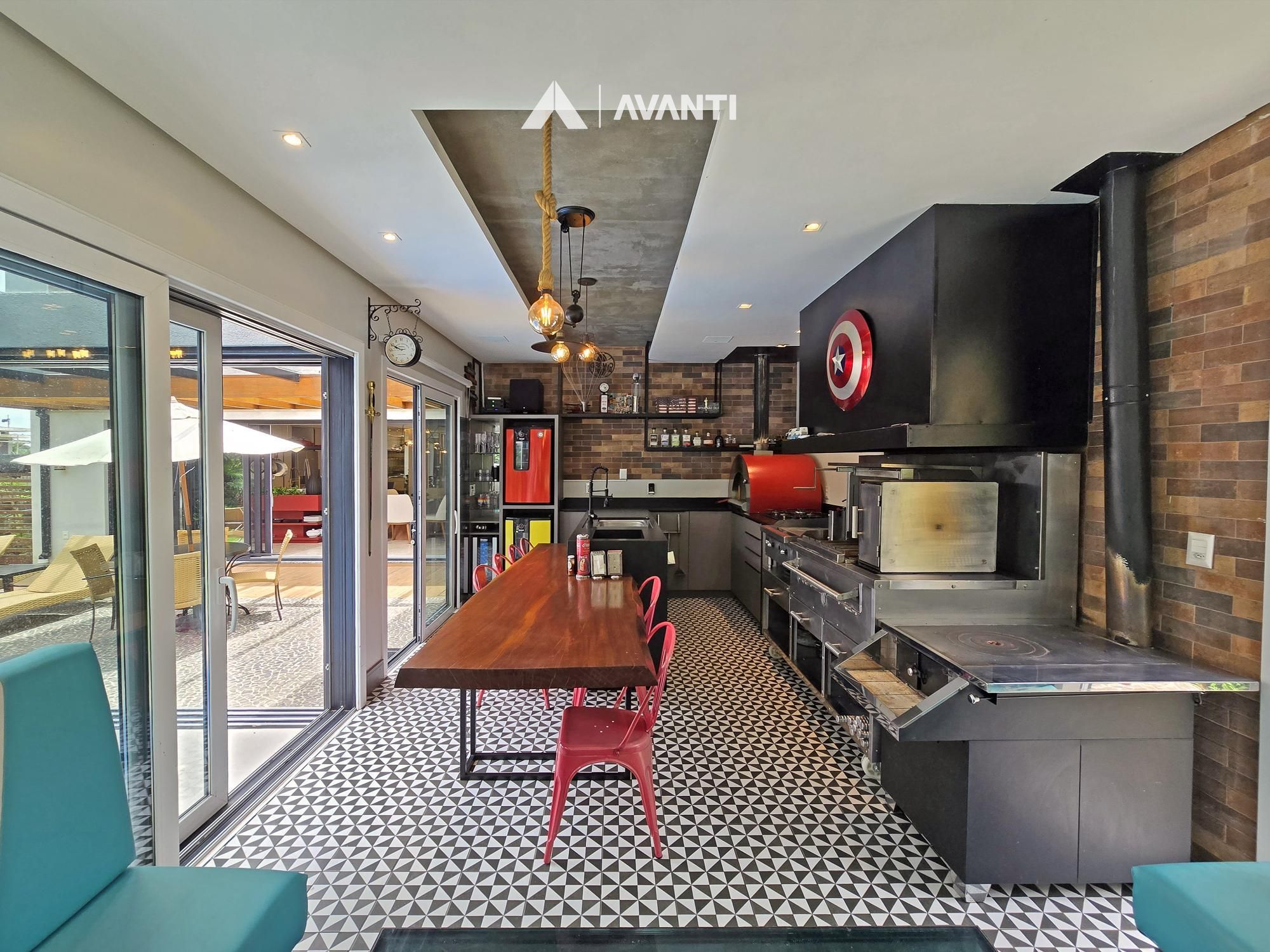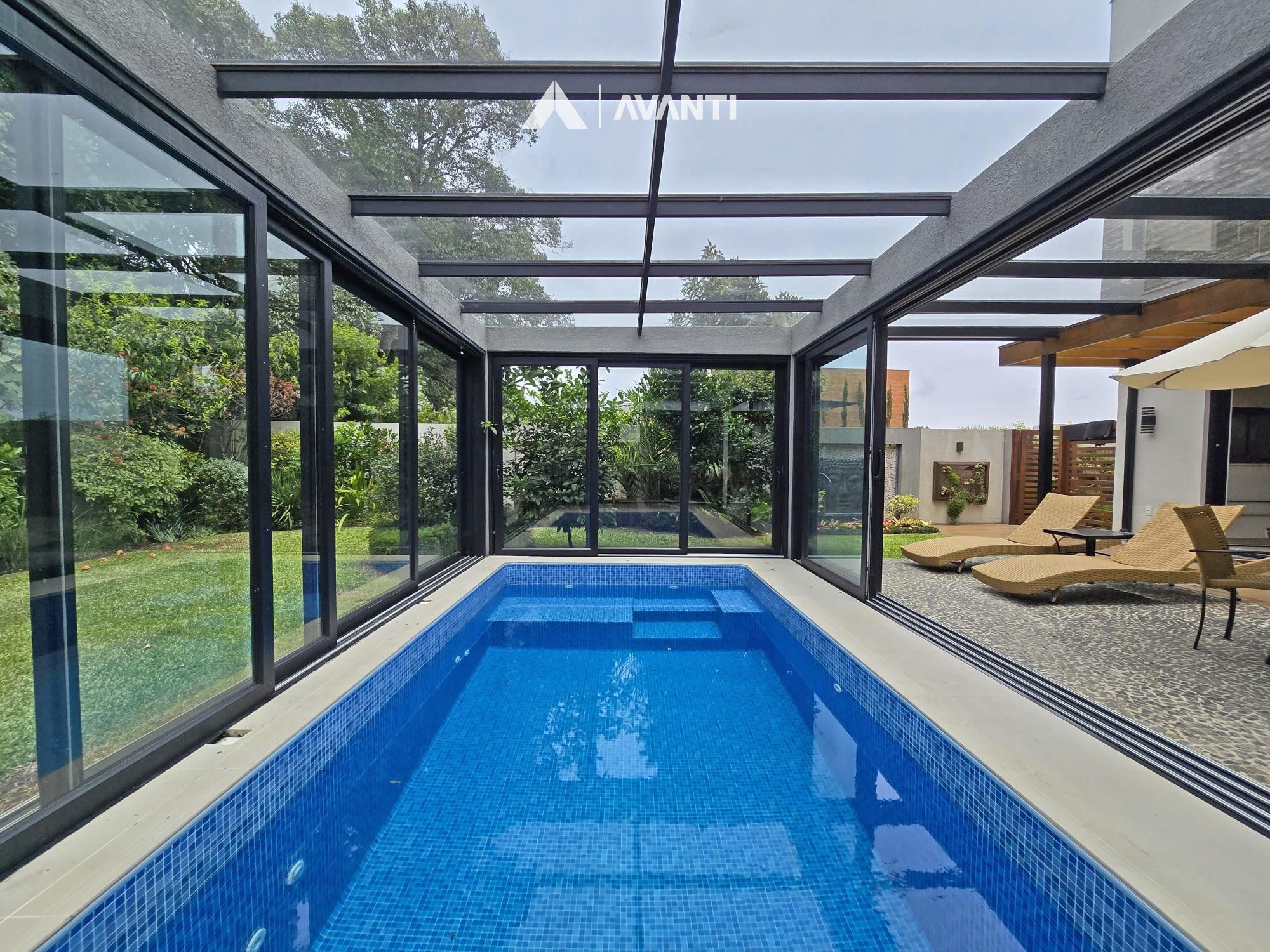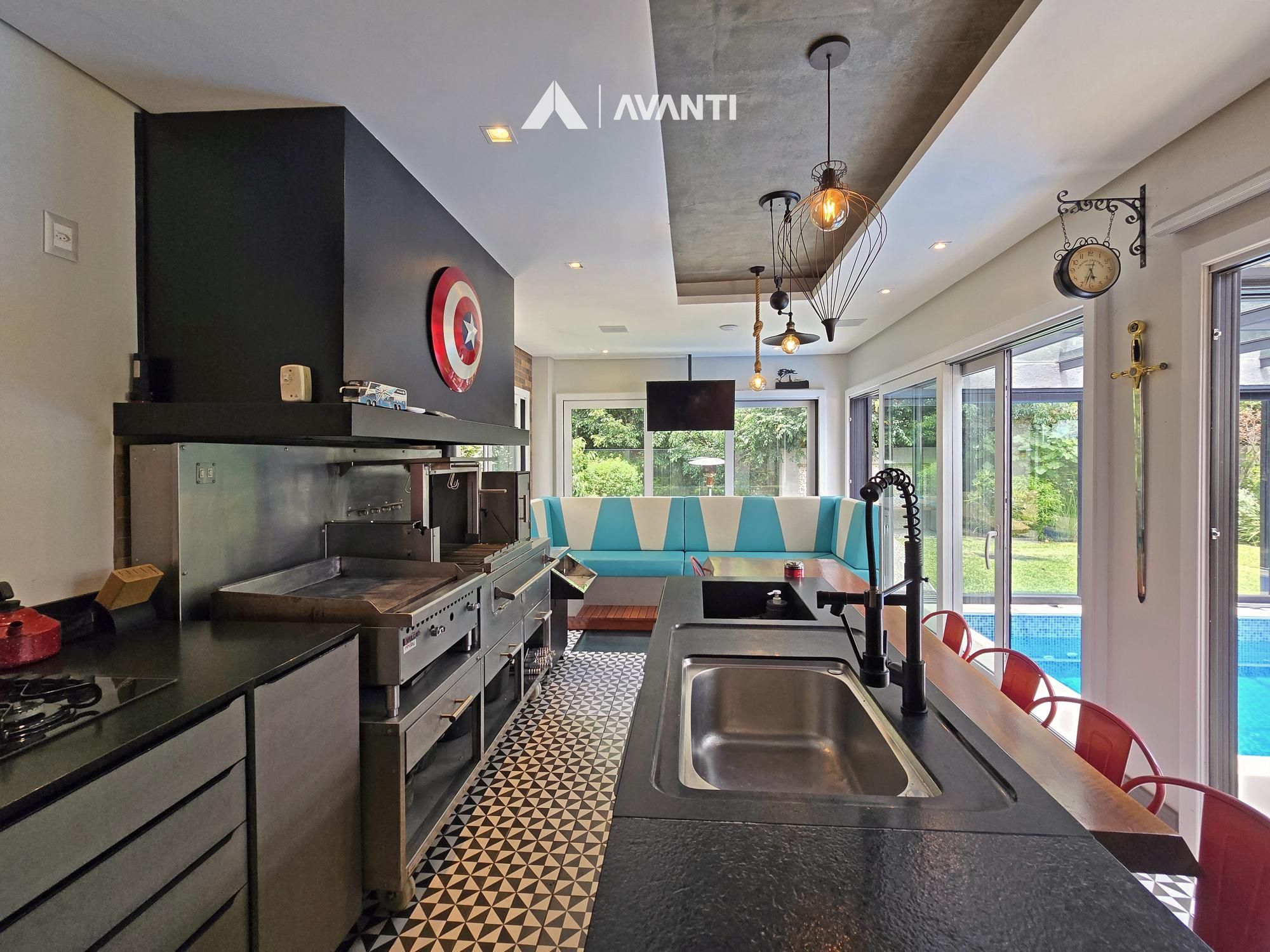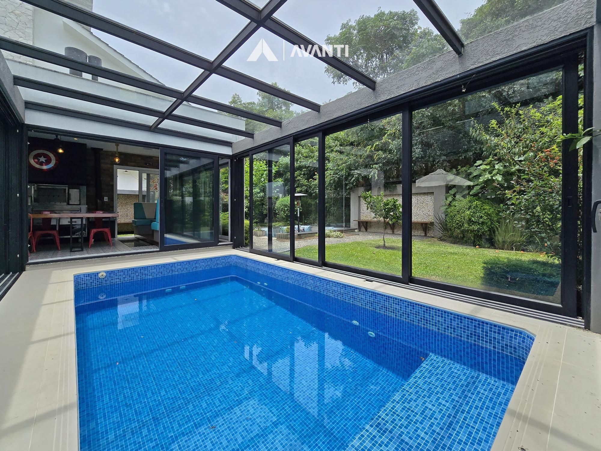 Com uma área externa espetacular, a casa possui piscina coberta e aquecida, fonte com sistema de filtragem UV e ozônio, quiosque gourmet completo com churrasqueira, forno de pizza e sistema de som, além de adega subterrânea com área de degustação.