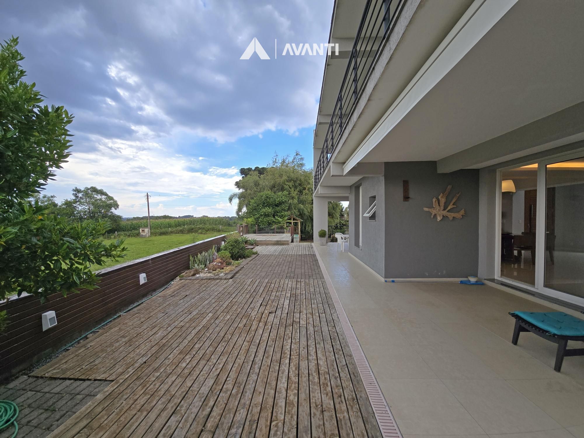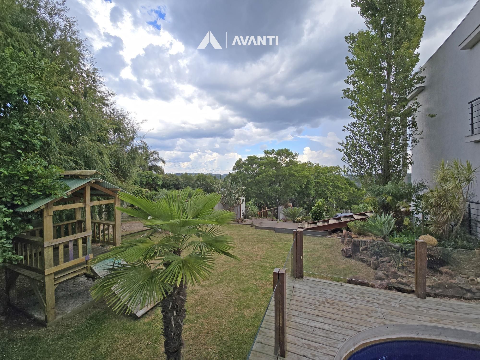 Do lado de fora, um amplo gramado circunda a casa, com árvores que emolduram o ambiente, jacuzzi com vista para o jardim e sistema de energia solar que reforça a sustentabilidade.