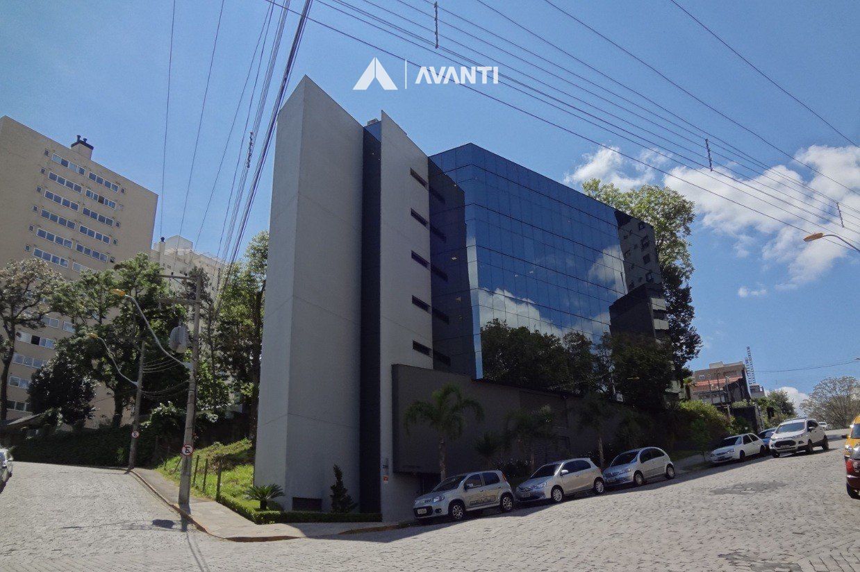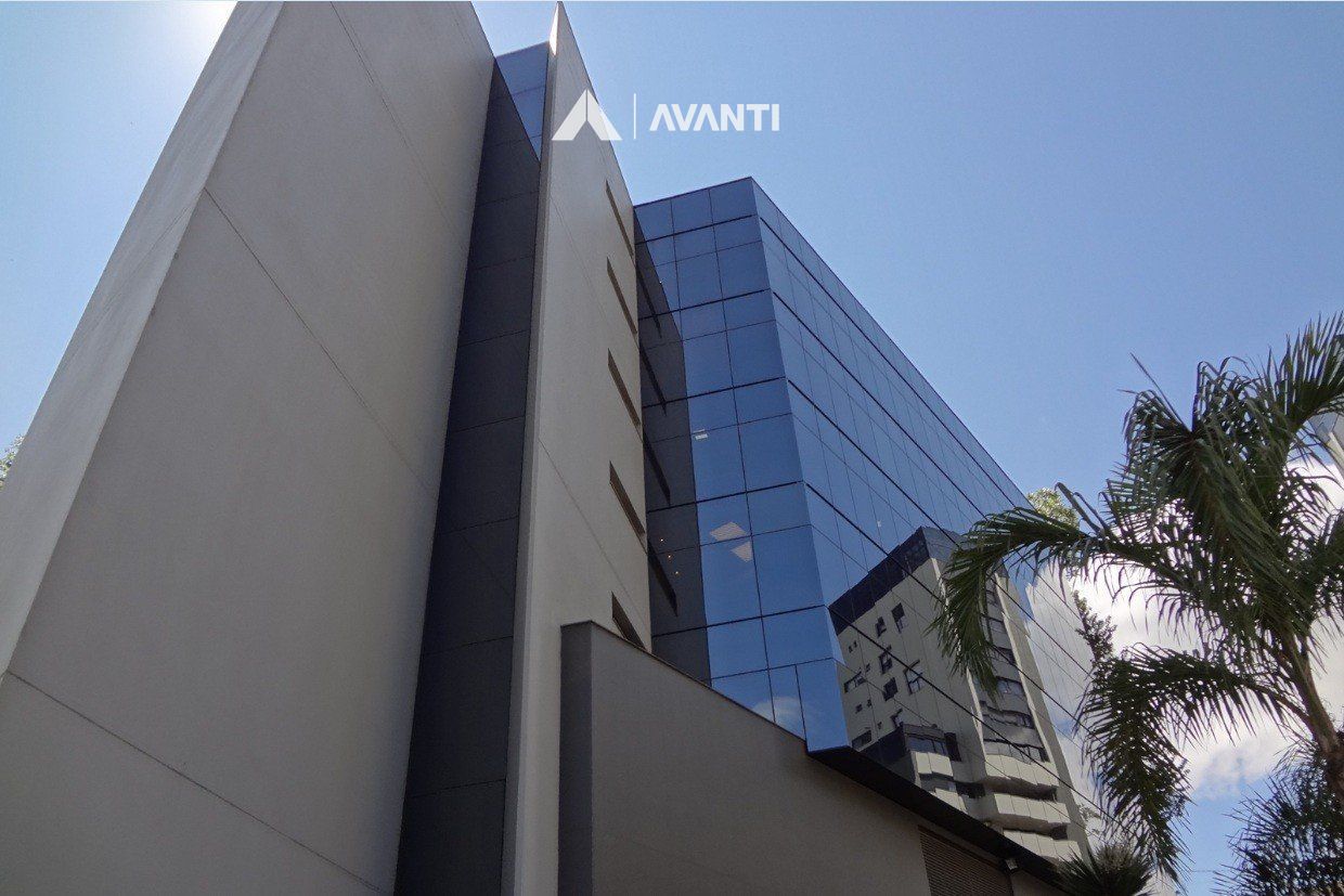 Condomínio com elevador panorâmico, câmeras de segurança e jardim.