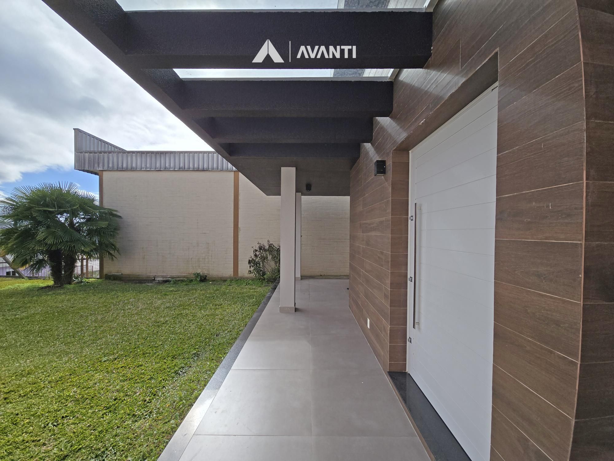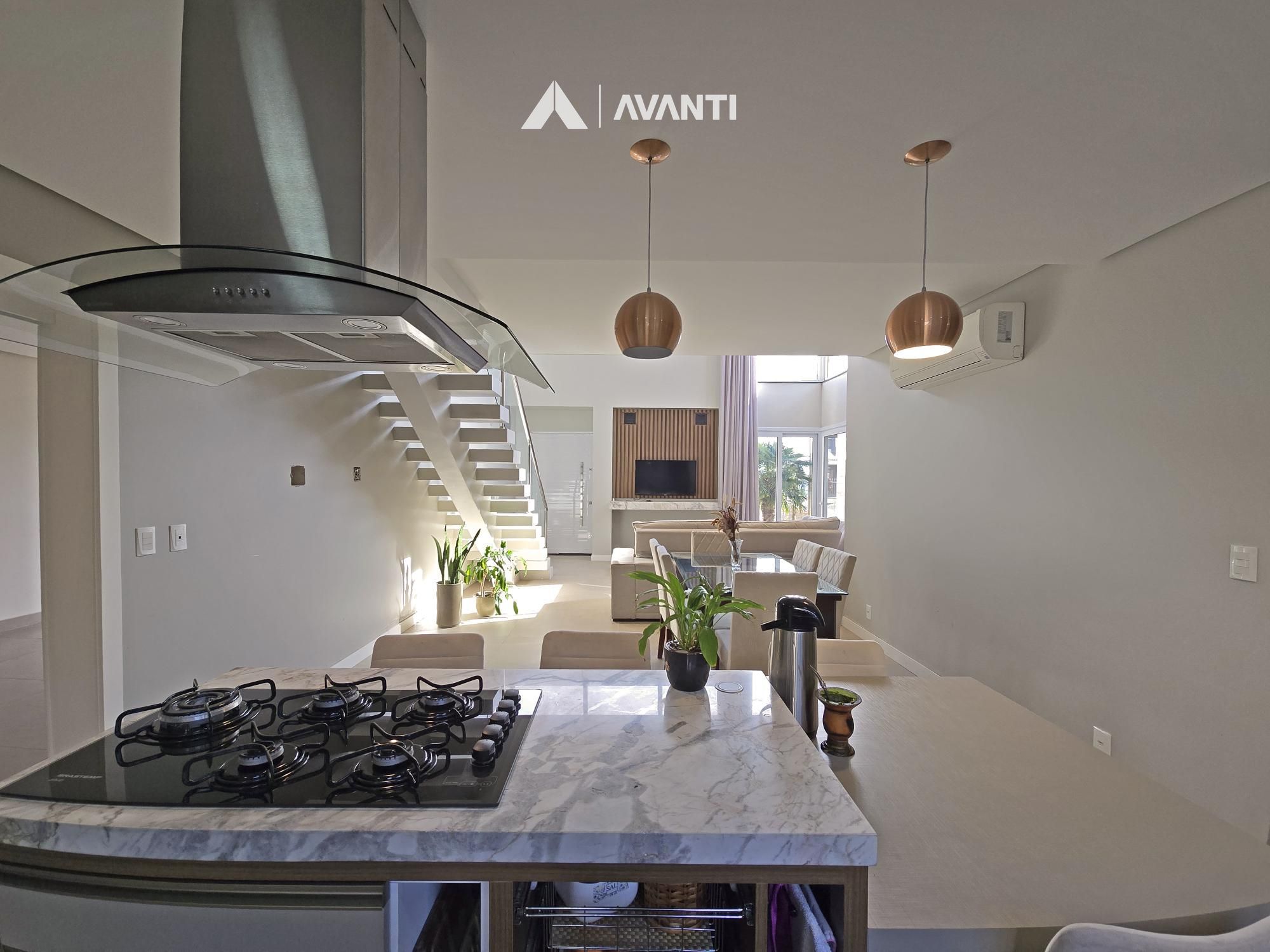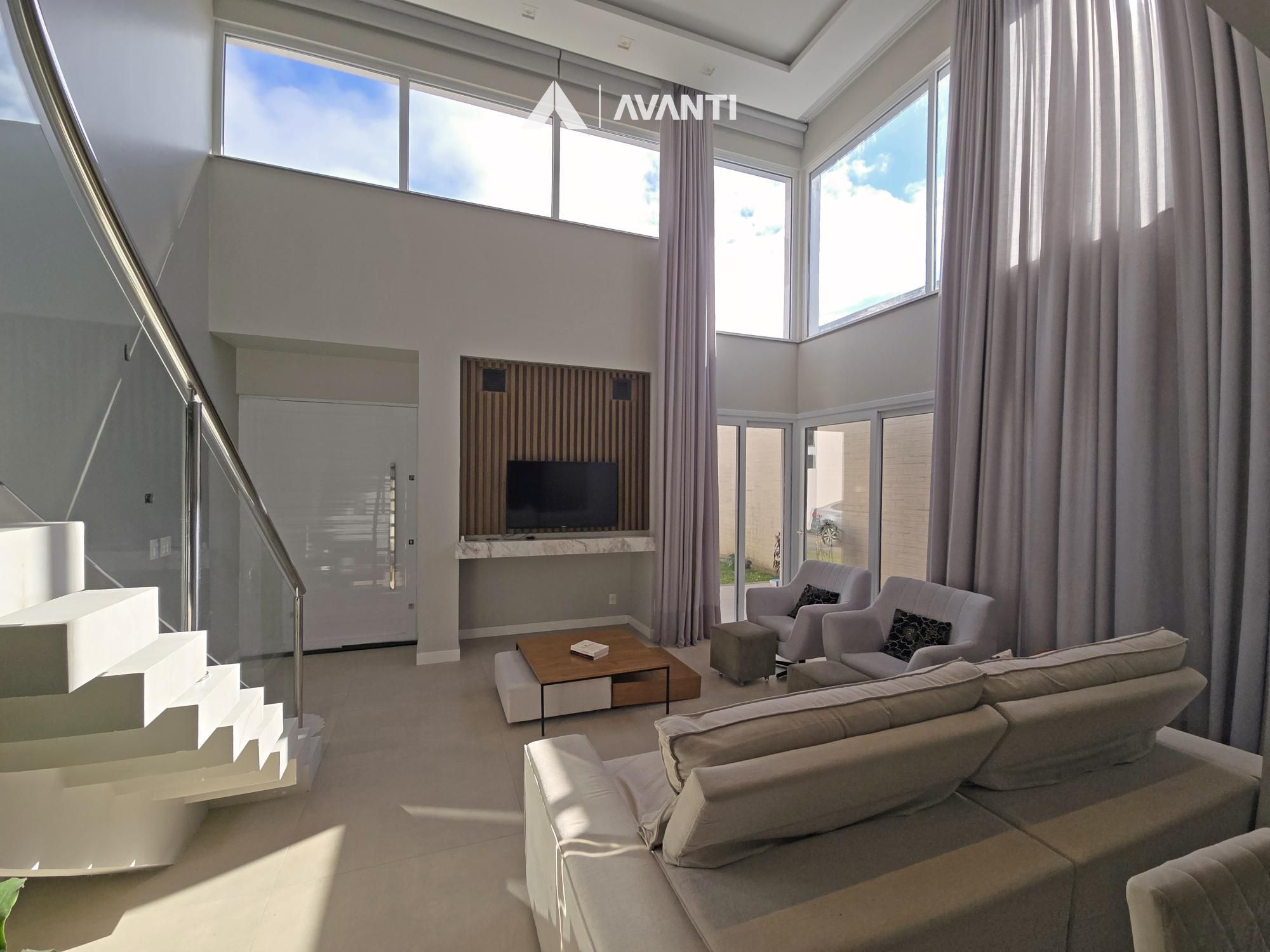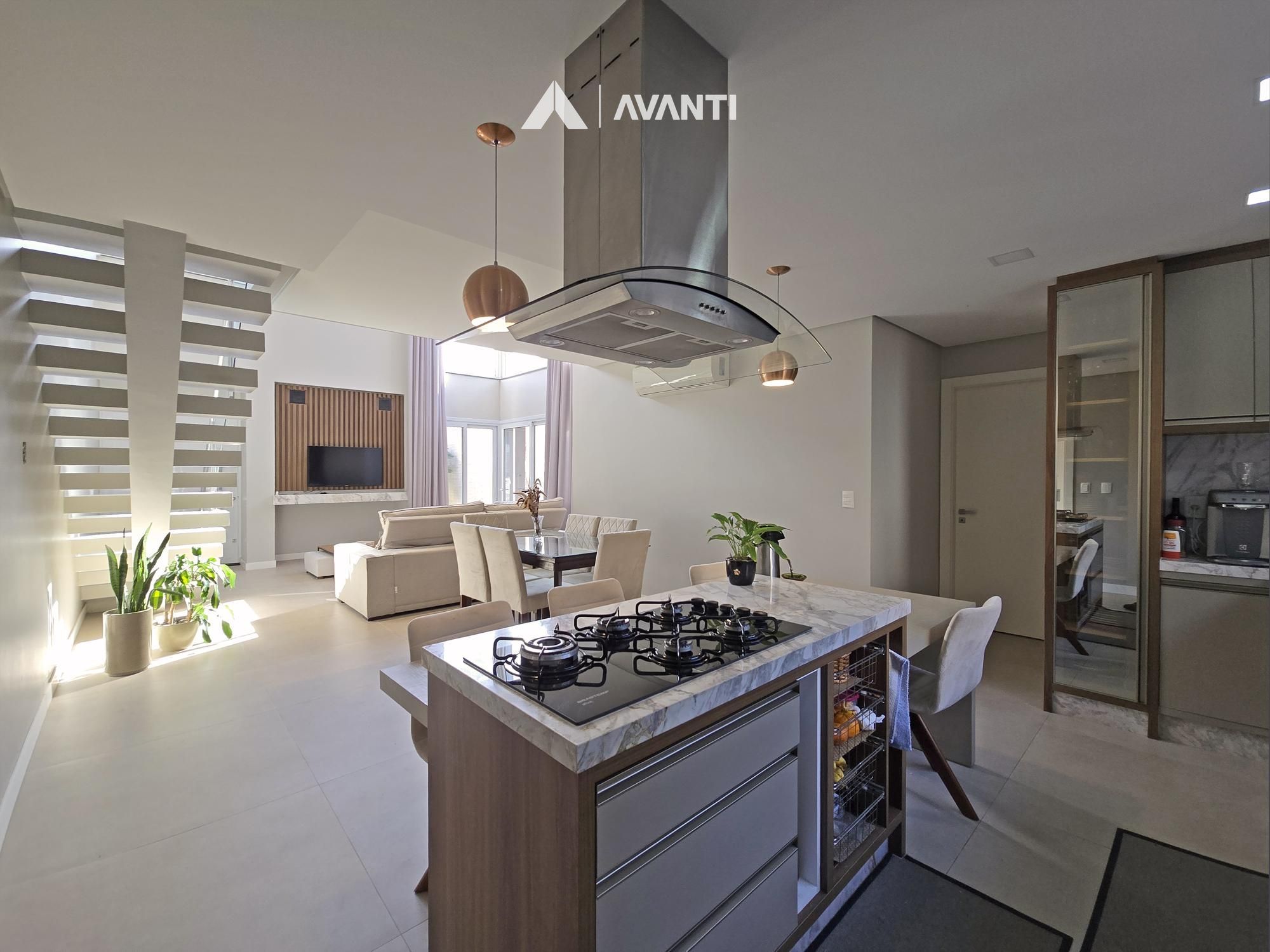 1º Pavimento: Amplo pátio com gramado e árvore, living com pé direito duplo e espera para lareira, sala de jantar, cozinha americana, dormitório, banheiro social e garagem que conta com espaço gourmet.