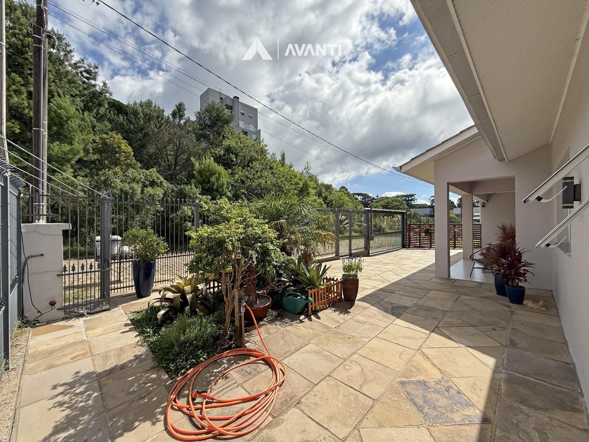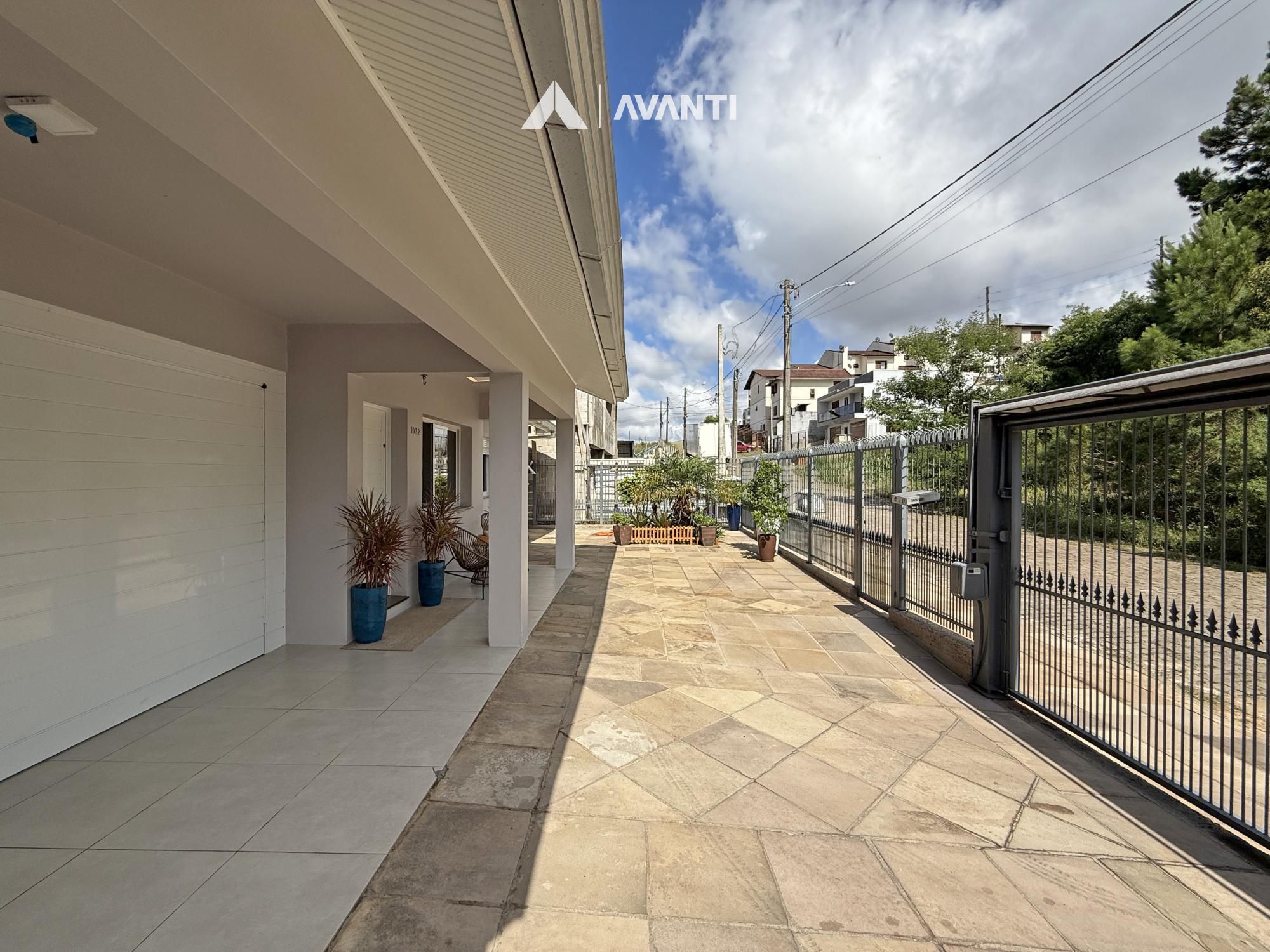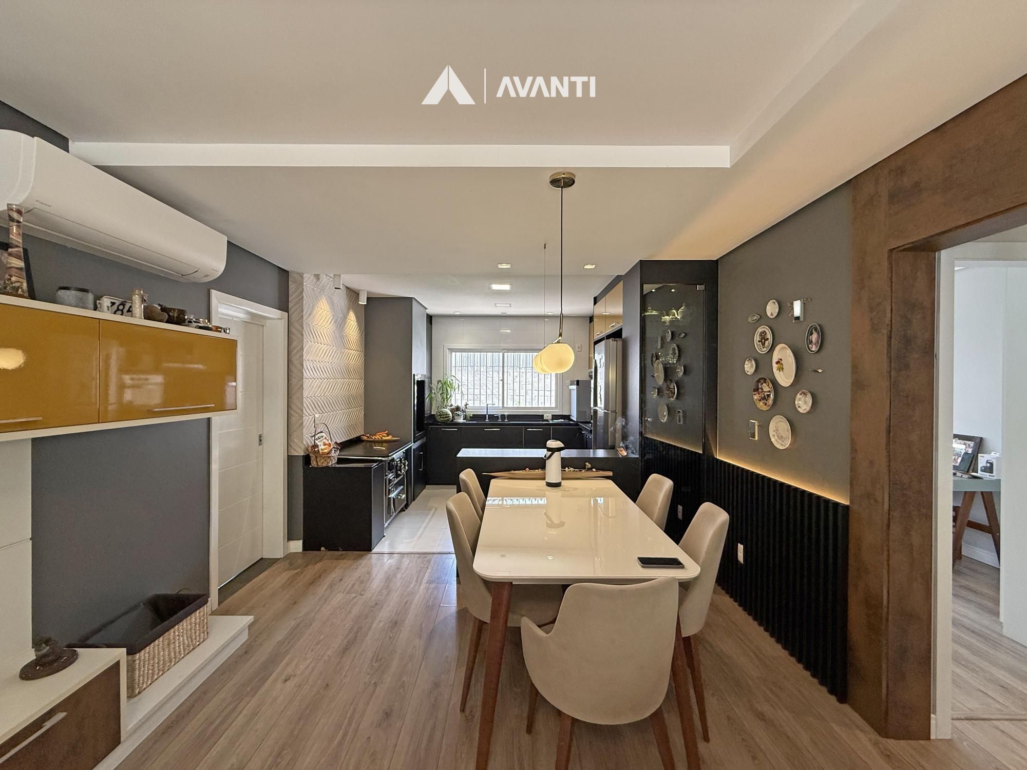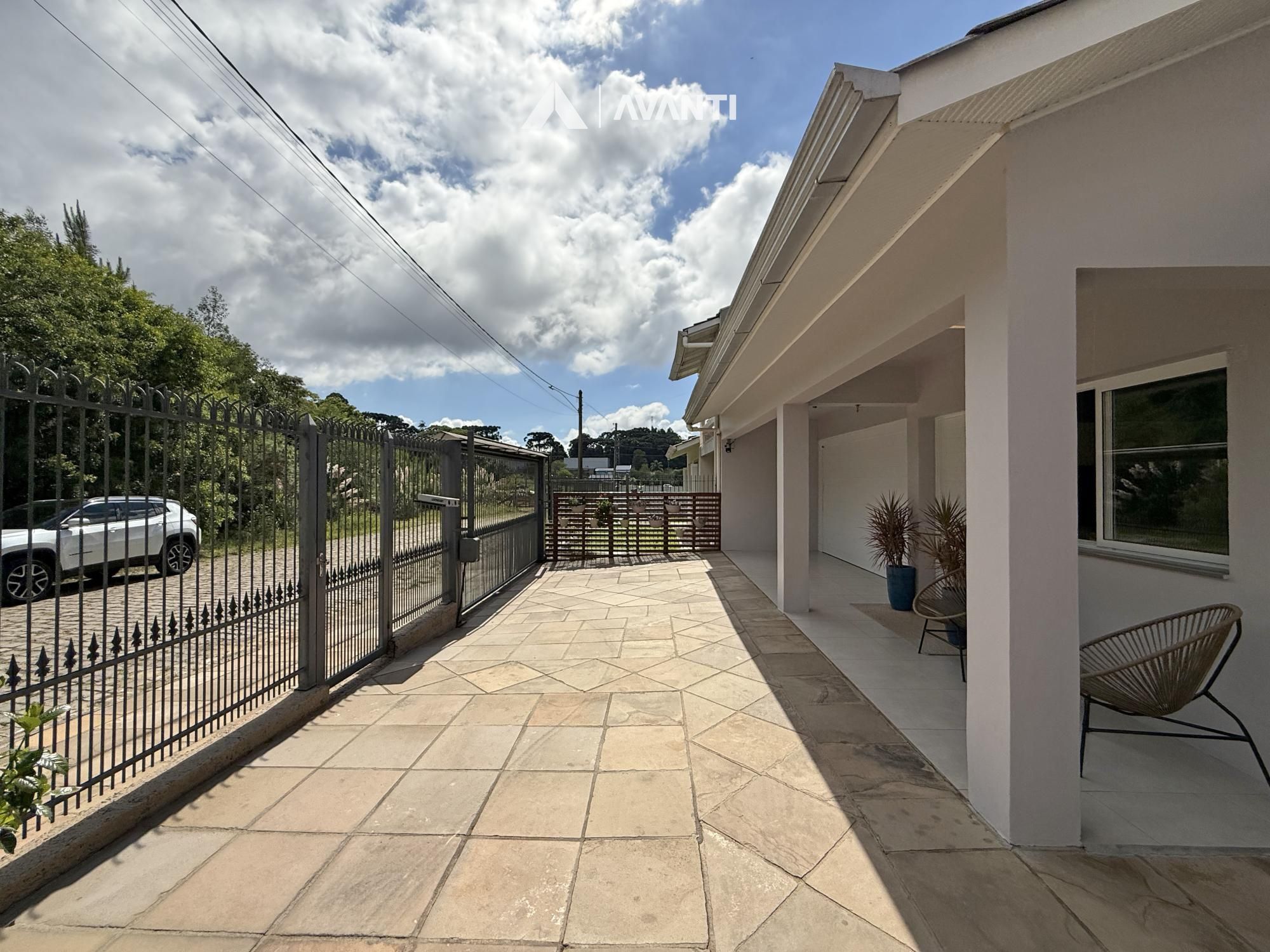 Construída em terreno de 371m², ela conta com um amplo living em conceito aberto, onde sala de estar, jantar e cozinha com bancada e fogão a lenha se integram de forma harmoniosa — ideal para o convívio familiar e para receber bem. A varanda à frente convida a momentos de descanso ao ar livre, enquanto a garagem com churrasqueira e pia de apoio complementa com praticidade.