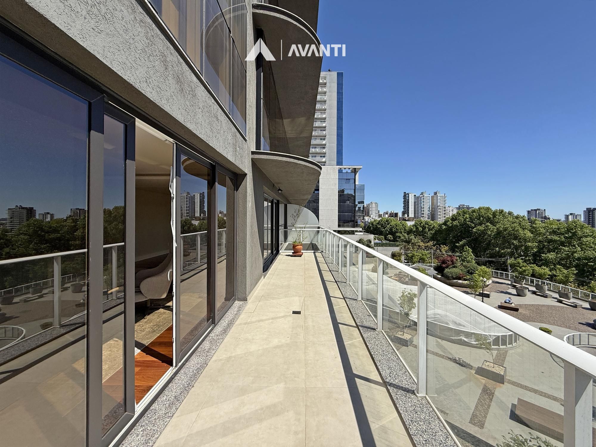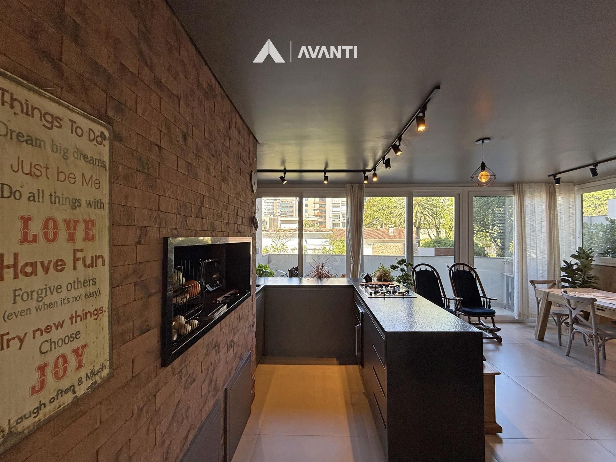 Hall de entrada com lavabo, imponente living 3 ambientes, sacada com vista definida para o parque, cozinha americana, ampla sacada gourmet com fogão a lenha e churrasqueira, parte da sacada aberta, e área de serviço separada com entrada auxiliar.