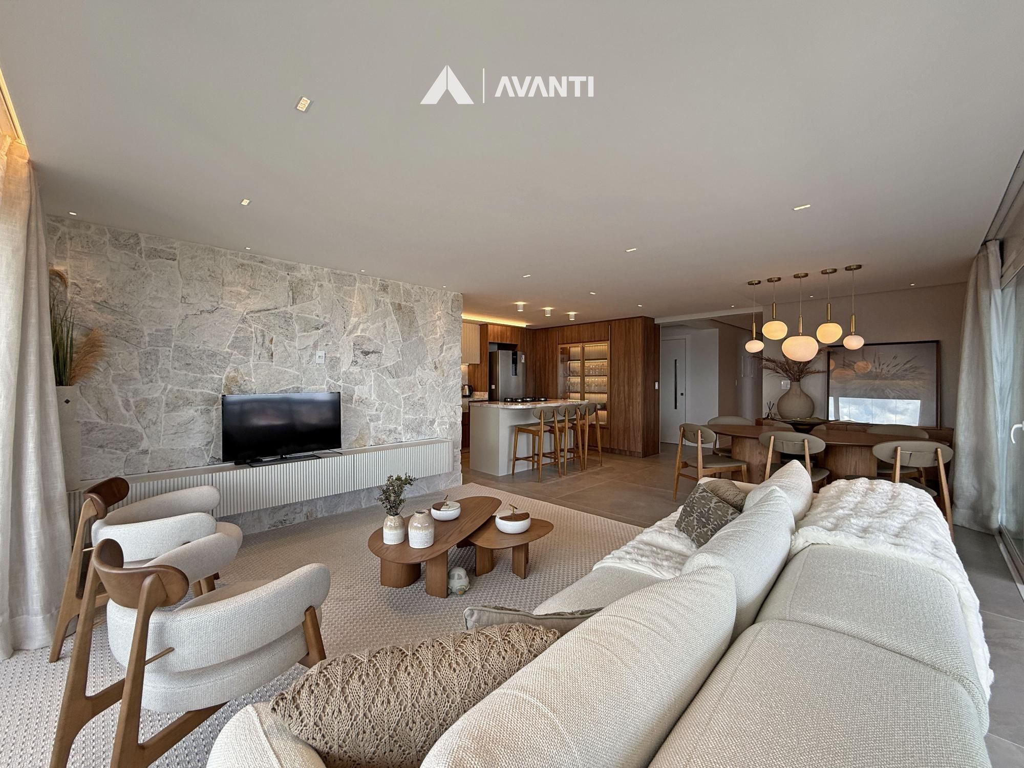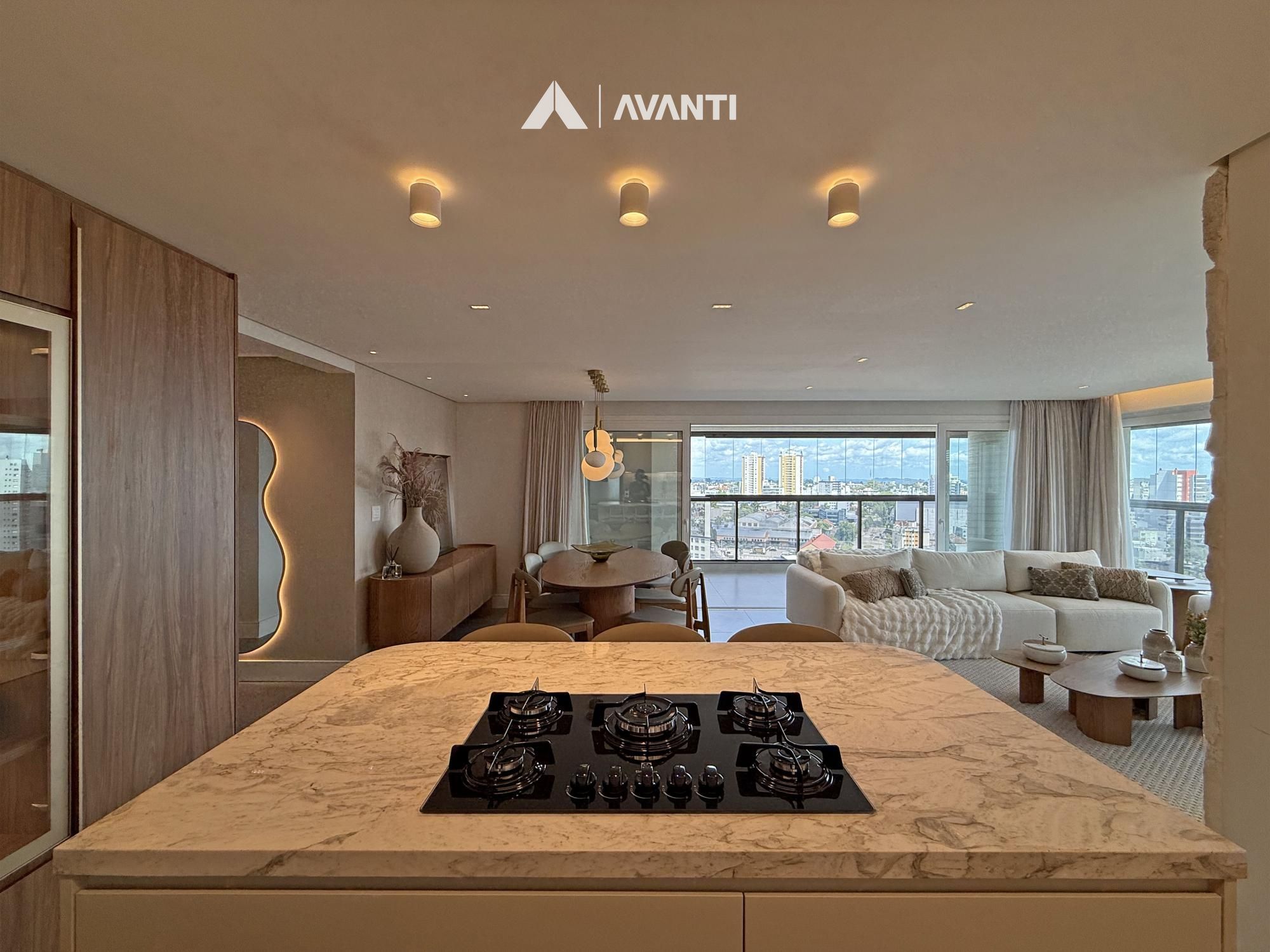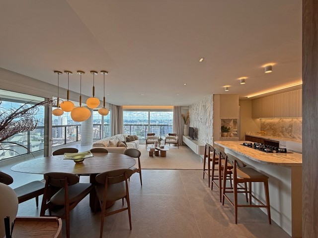 Com 176m² privativos, o layout privilegia o convívio: cozinha americana integrada ao estar e jantar, conectada a uma ampla varanda gourmet com vista panorâmica e fechamento reiki. A excelente posição solar norte/oeste reforça a sensação de amplitude, enquanto a lavanderia com acesso à sacada e os banhos com ventilação e iluminação natural agregam funcionalidade ao dia a dia.
