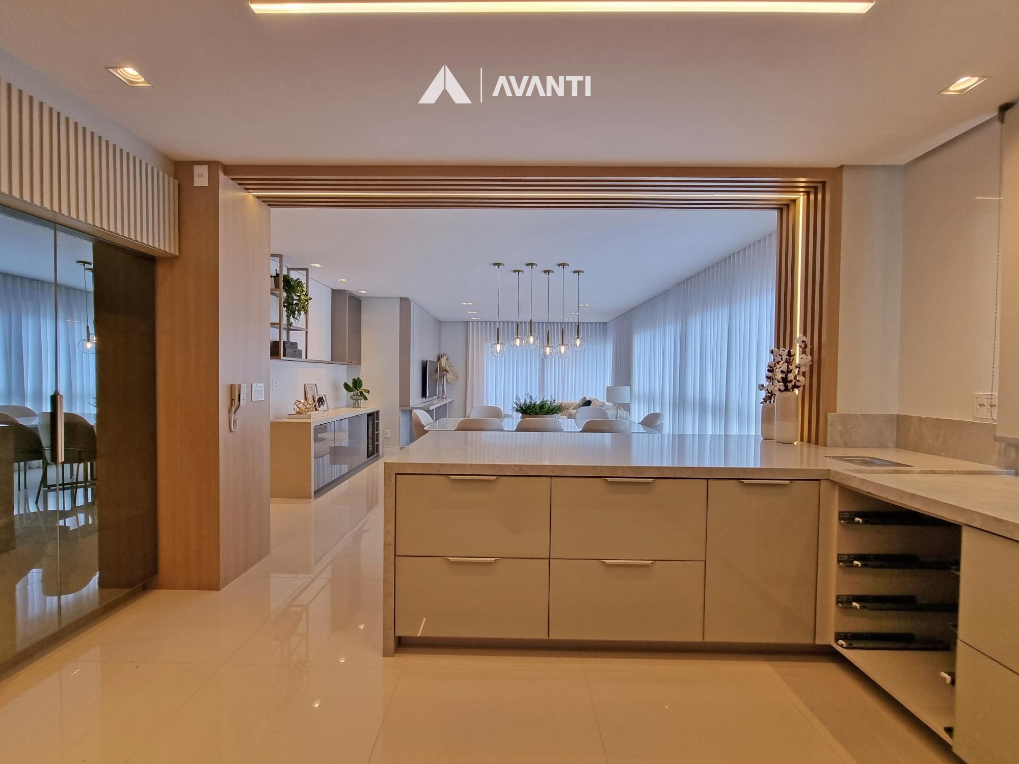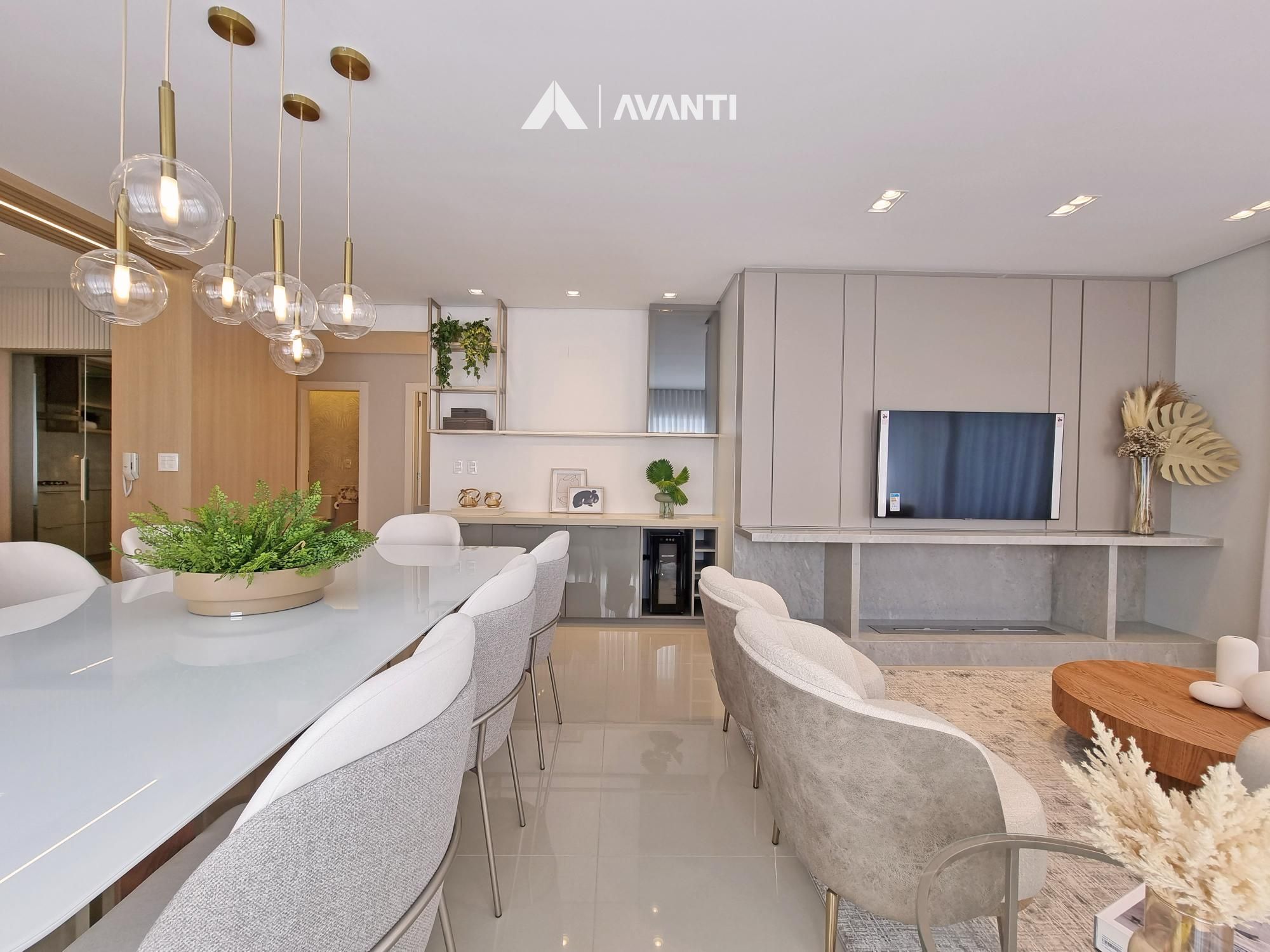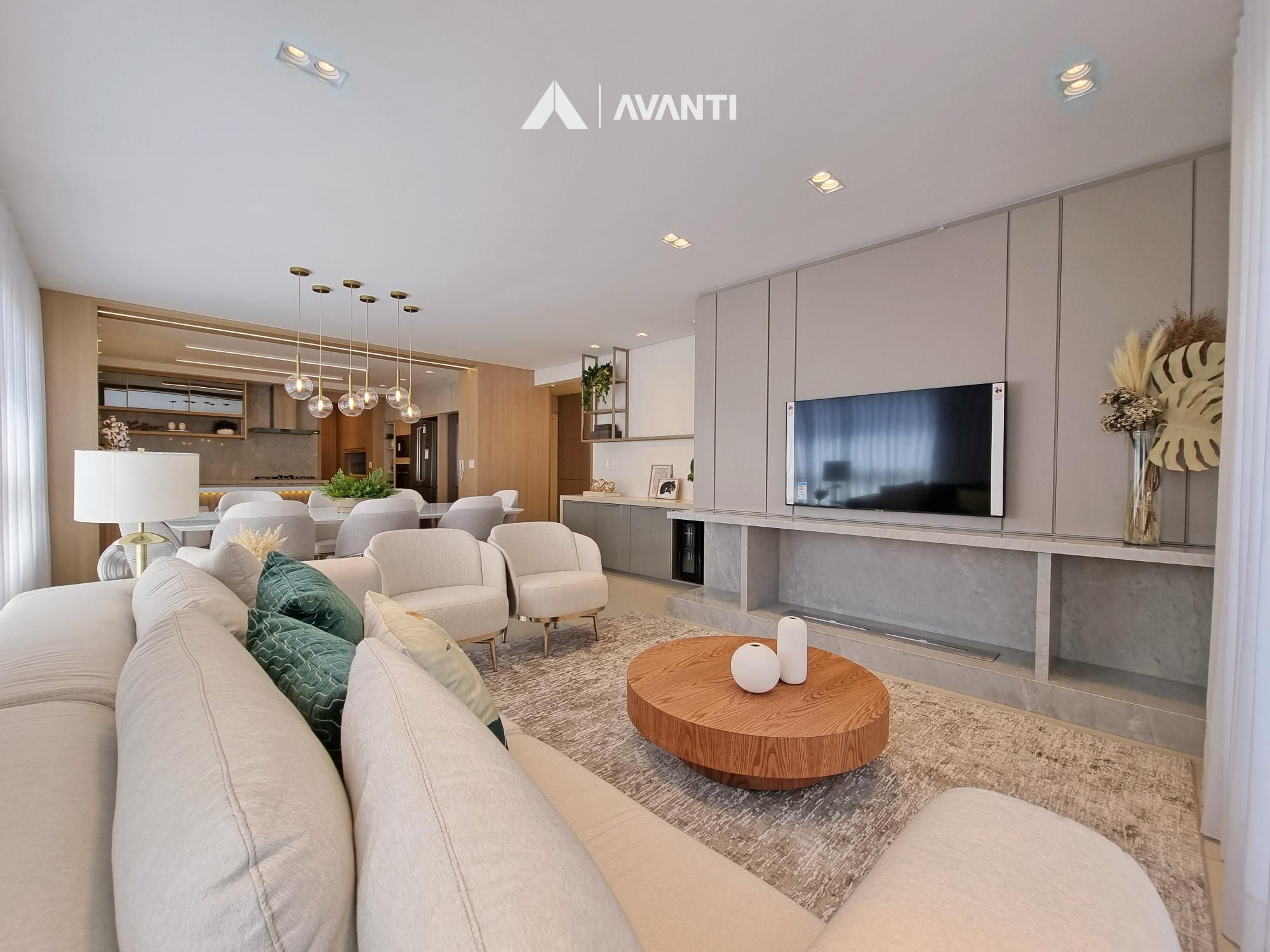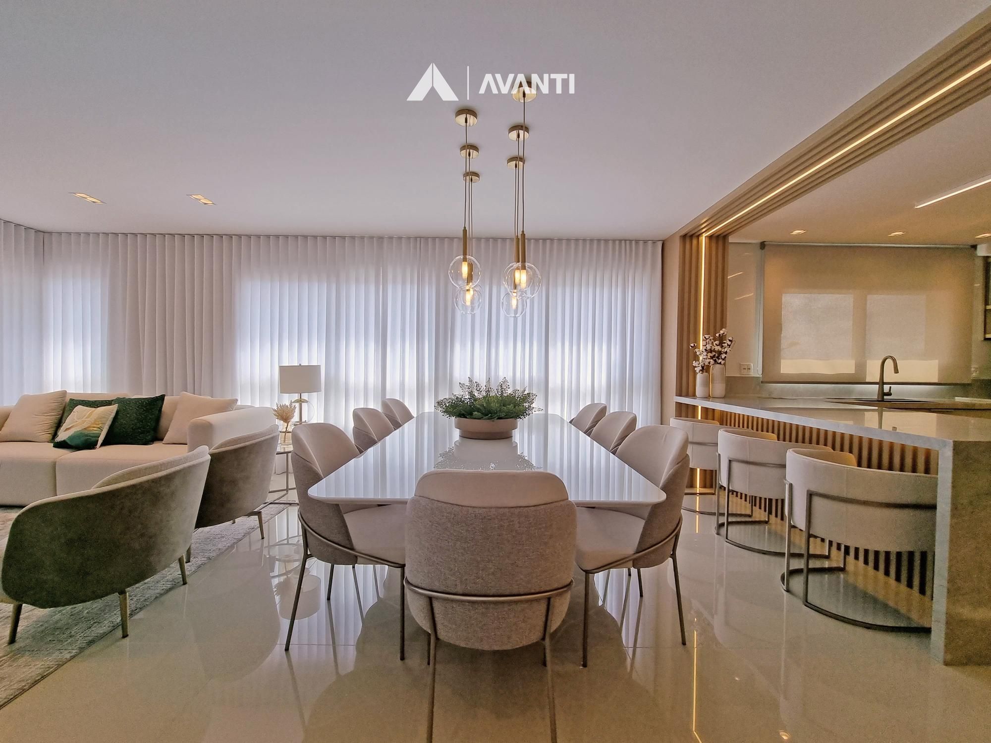 Conta com majestoso living 3 ambientes que comporta sala de estar com sacada, sala de jantar e cozinha com churrasqueira. Dispõe de hall de entrada, lavabo e área de serviço com sacada.