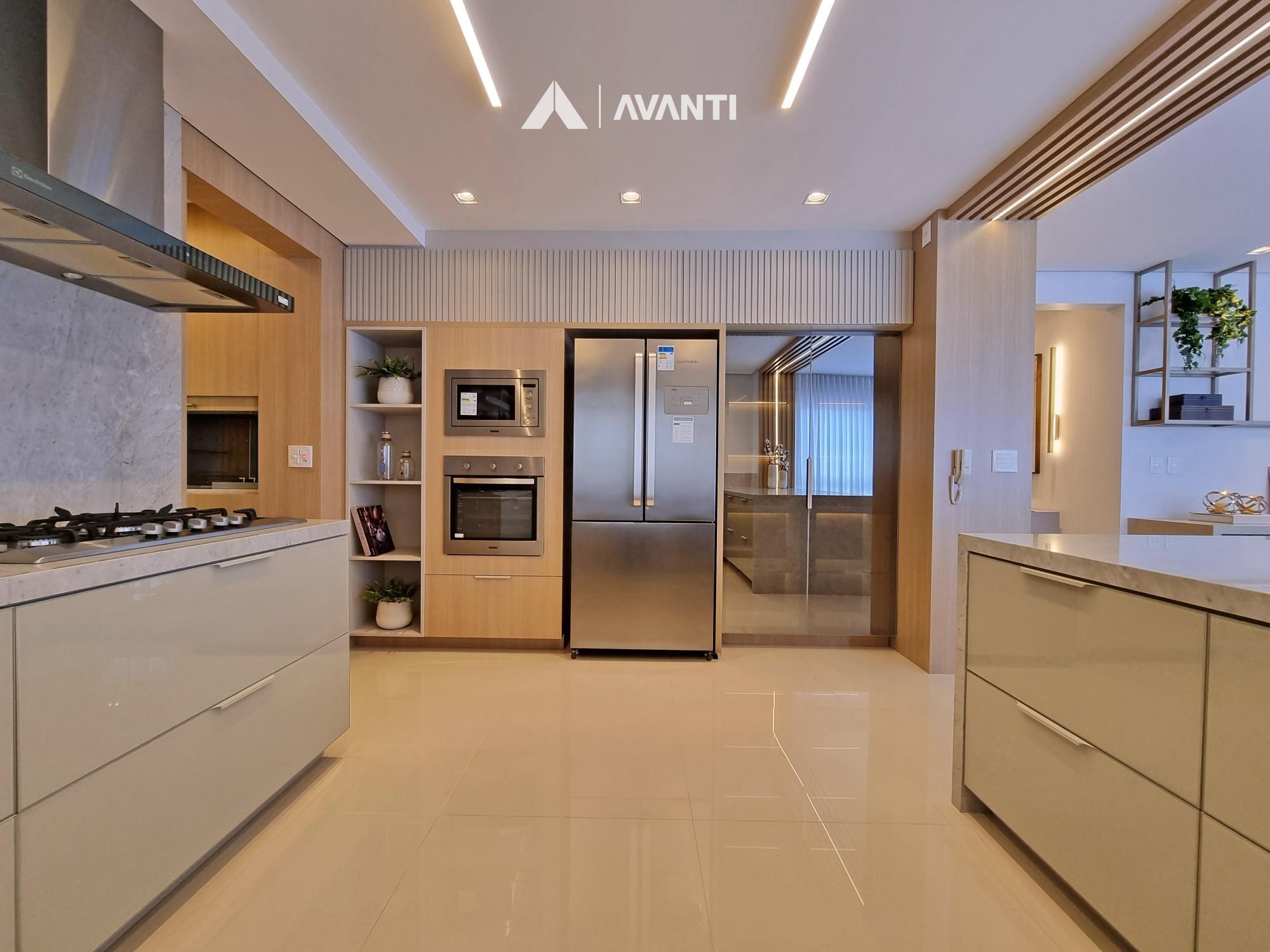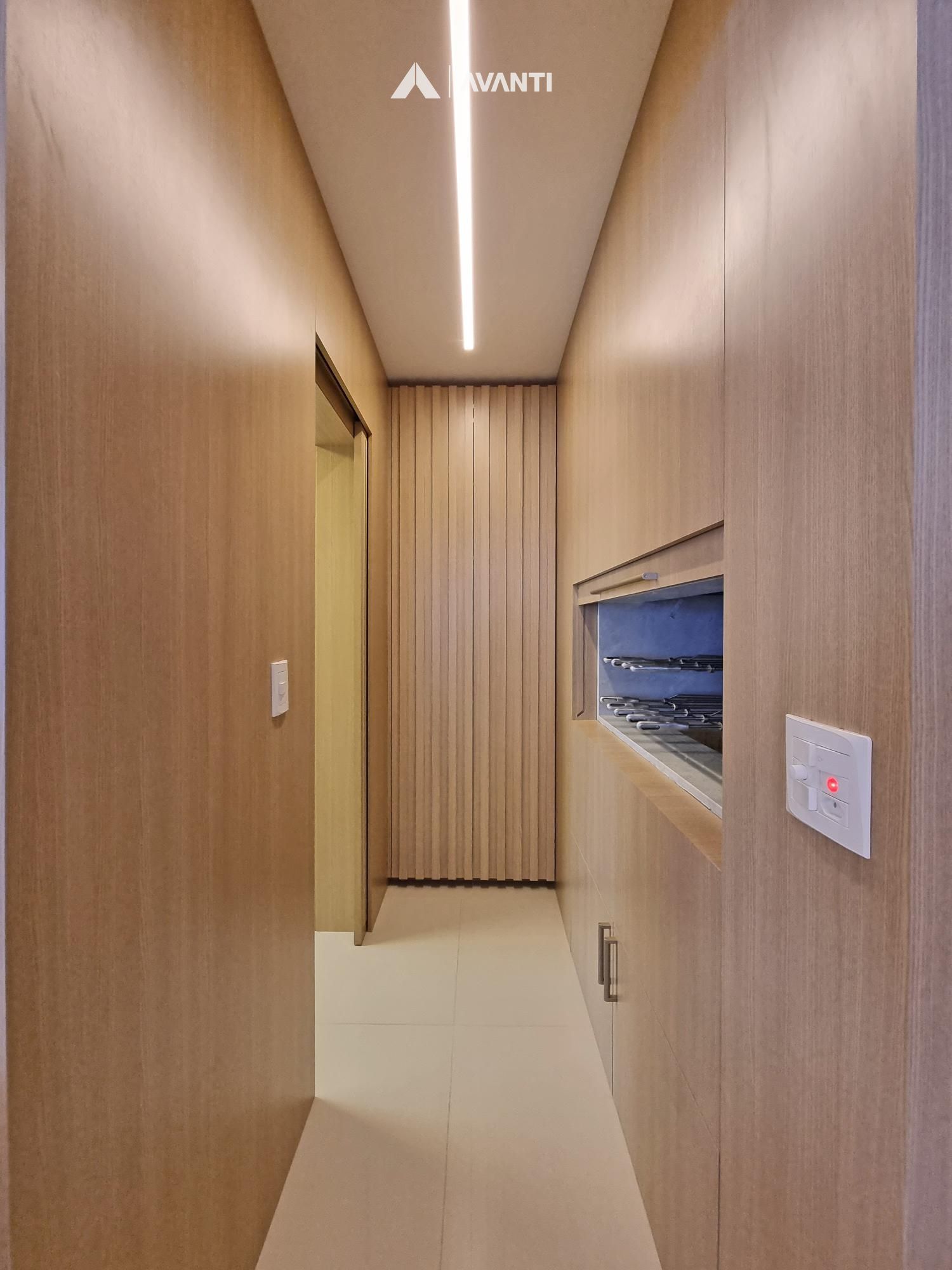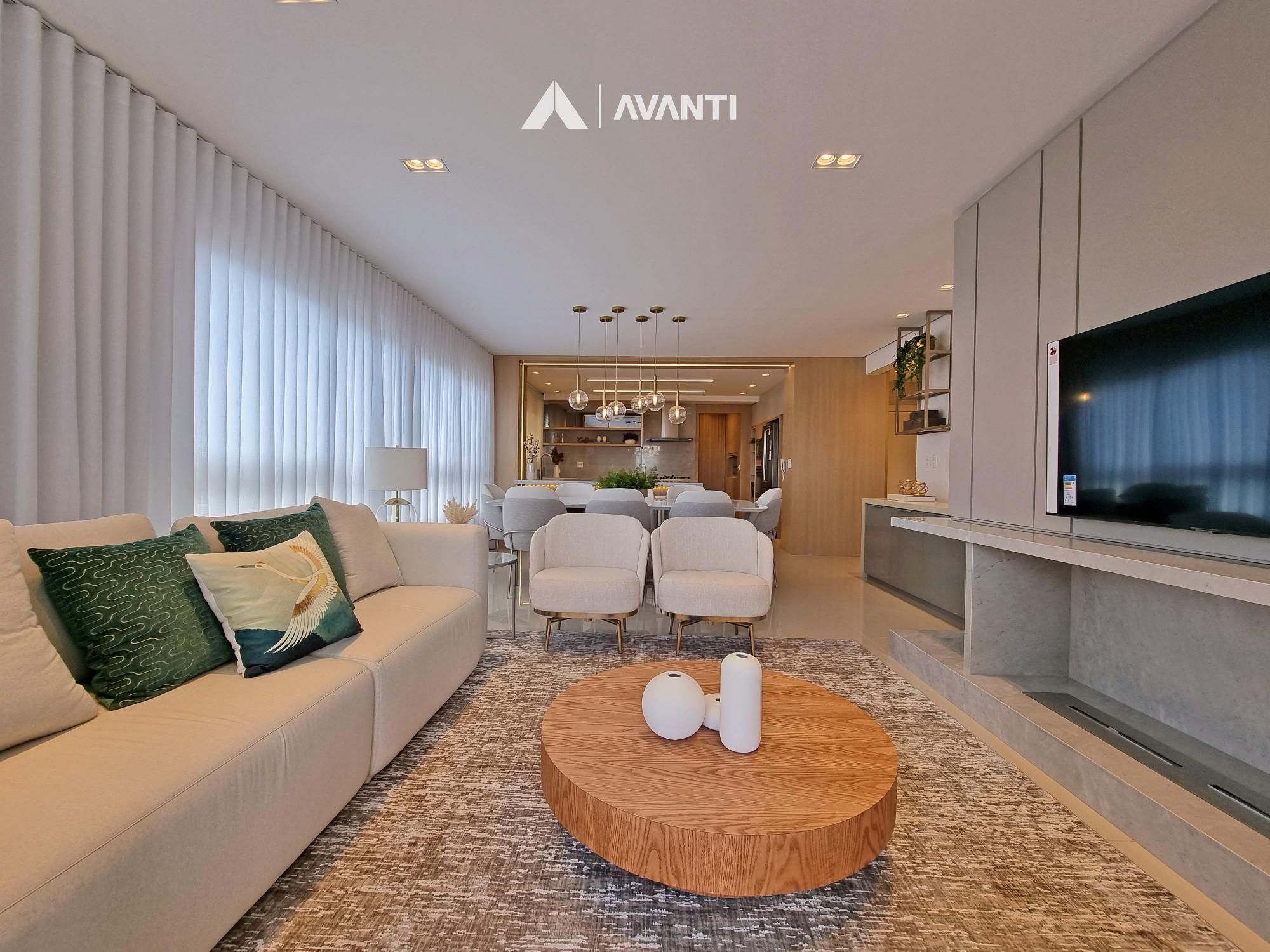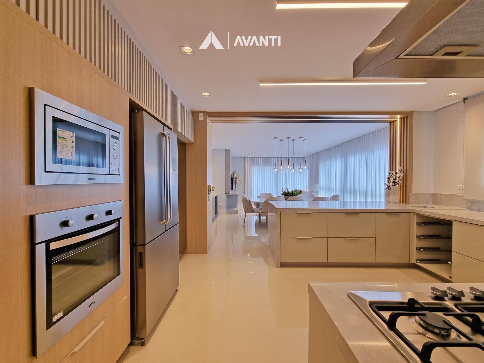 Conta com majestoso living 3 ambientes que comporta sala de estar com sacada, sala de jantar e cozinha com churrasqueira. Dispõe de hall de entrada, lavabo e área de serviço com sacada.