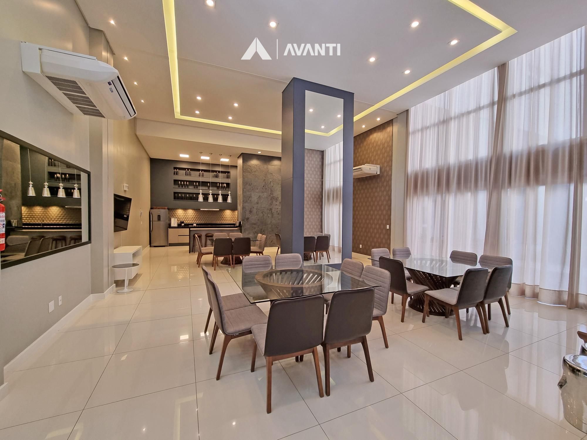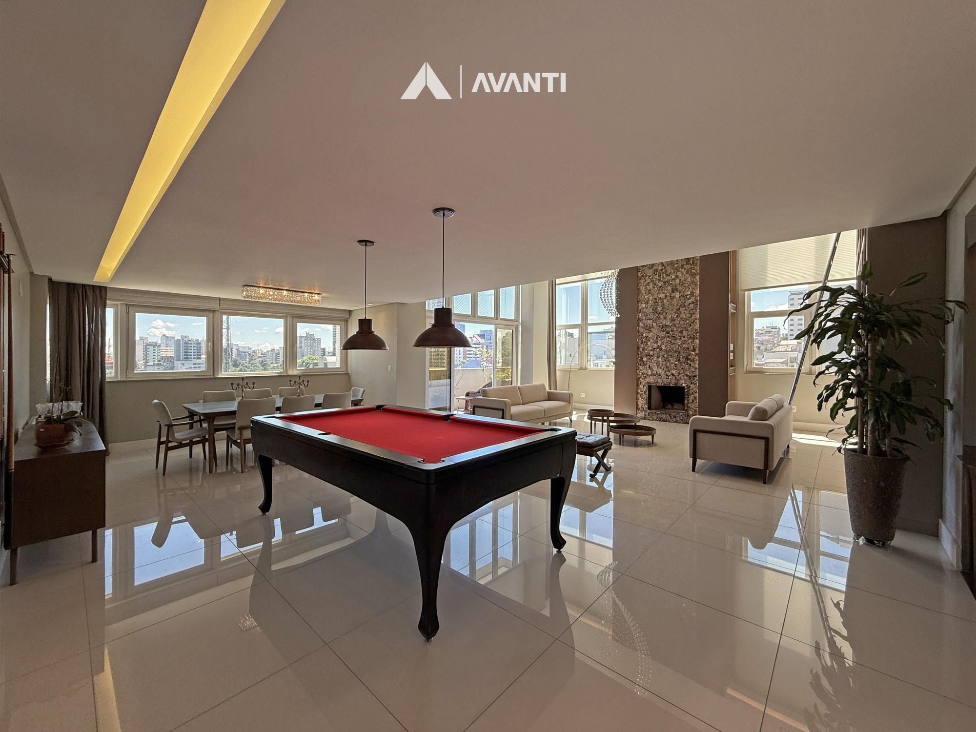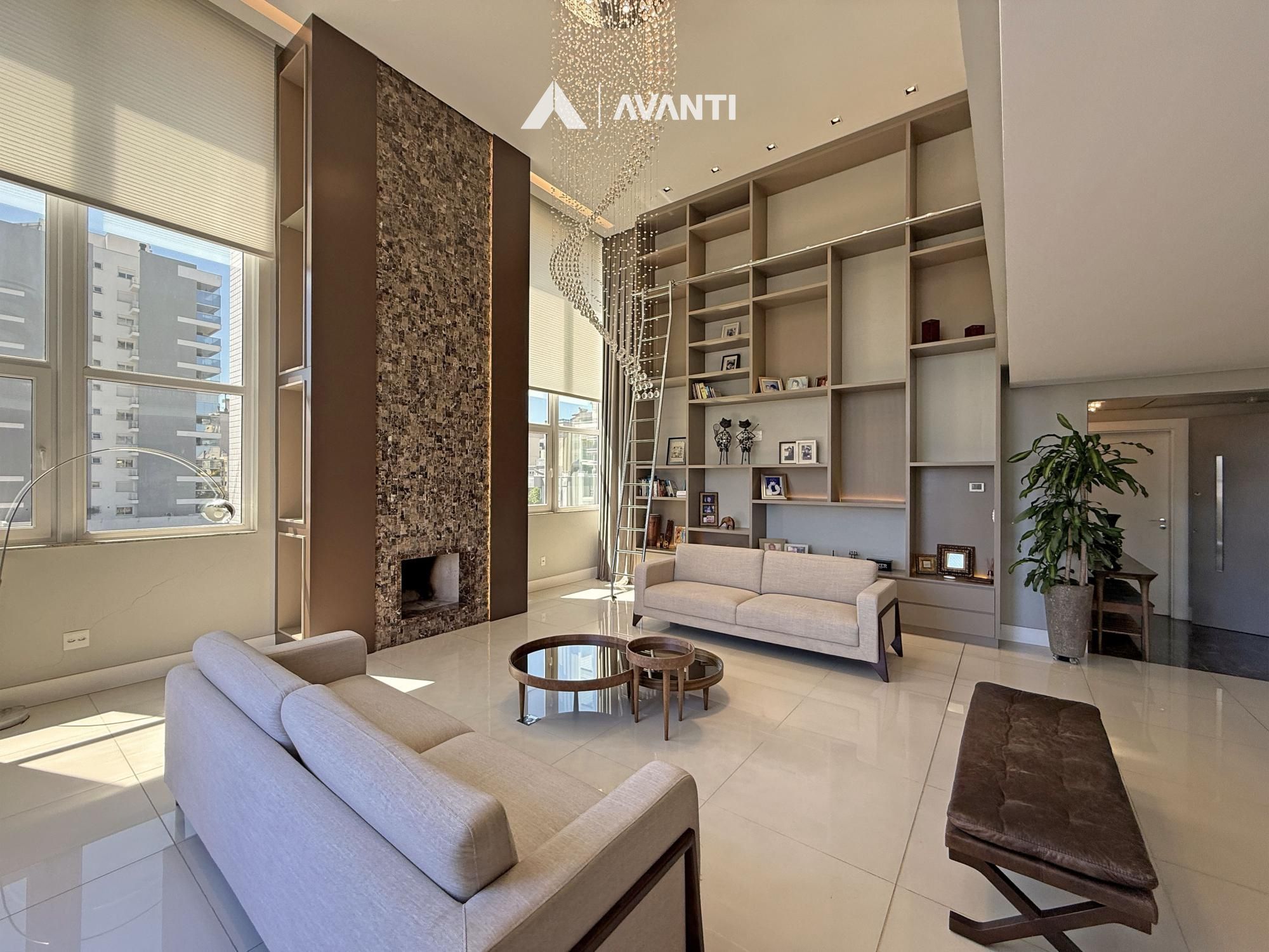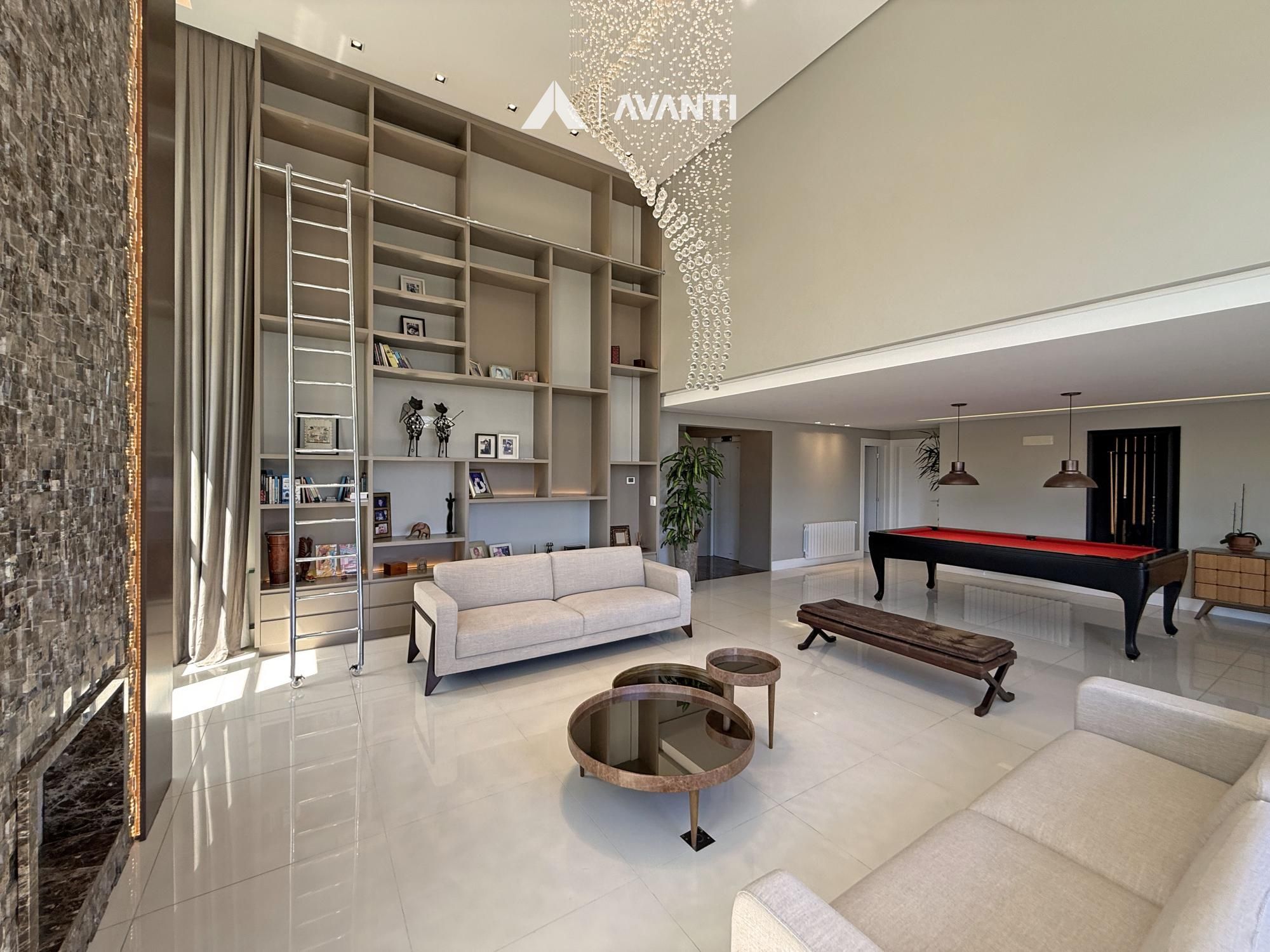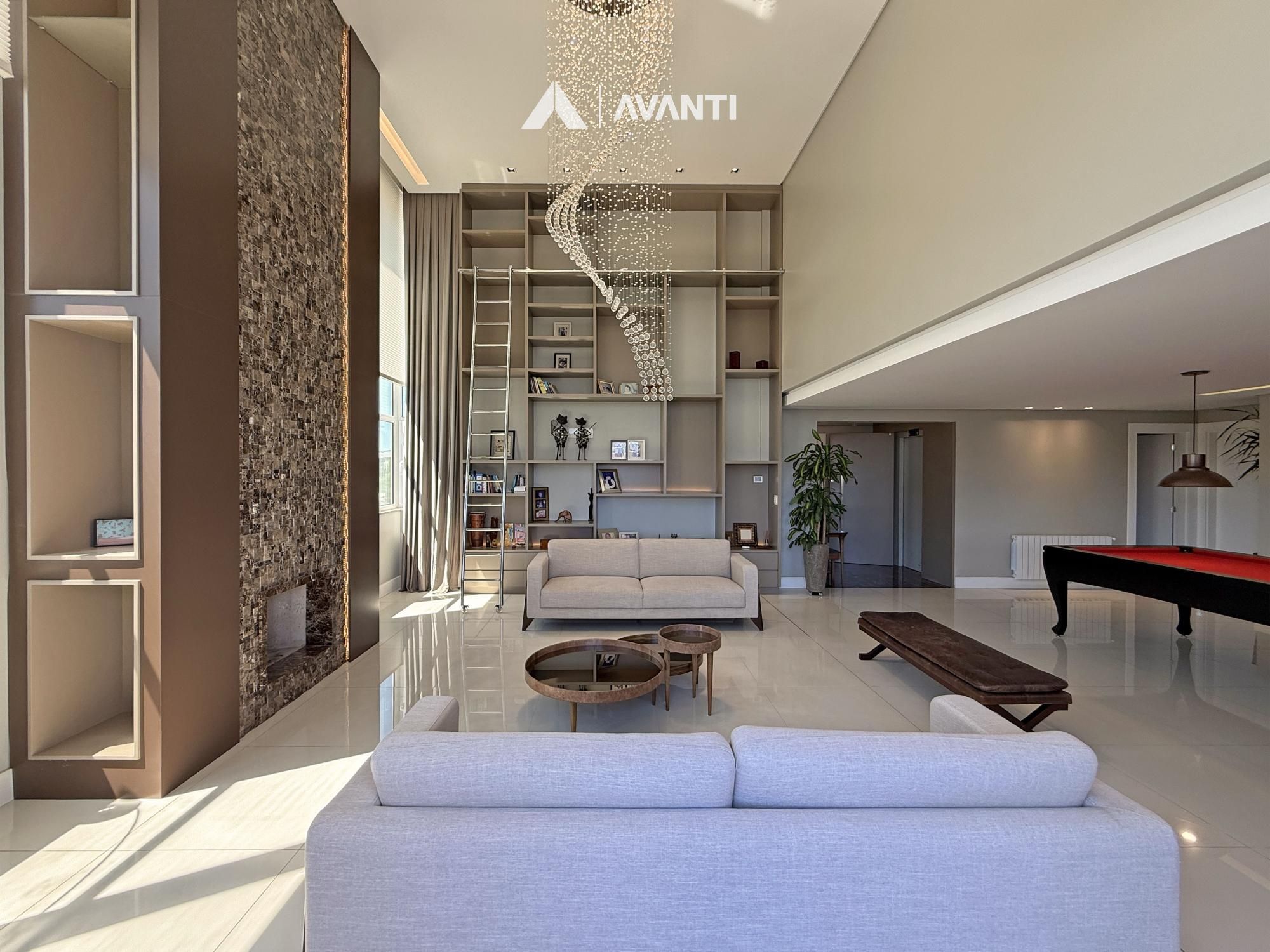 Composto por grandioso living 3 ambientes, dispõe de pé direito duplo com lareira e biblioteca, sala de jantar, sala de estar, cozinha americana com churrasqueira, sala TV, lavabo, área de serviço com dependência e banheiro auxiliar.