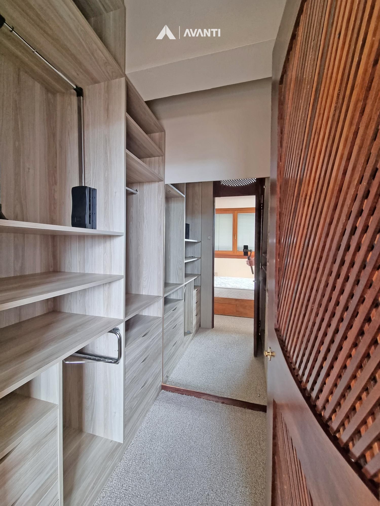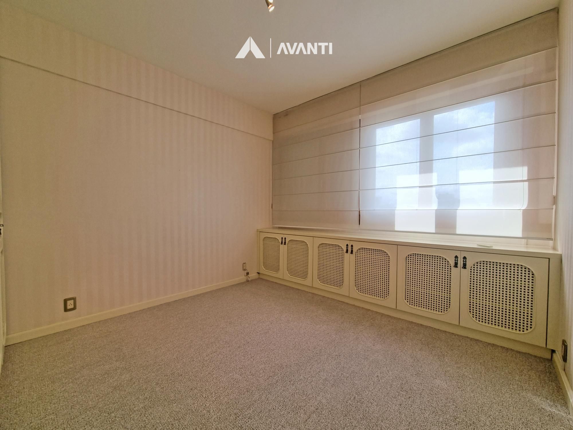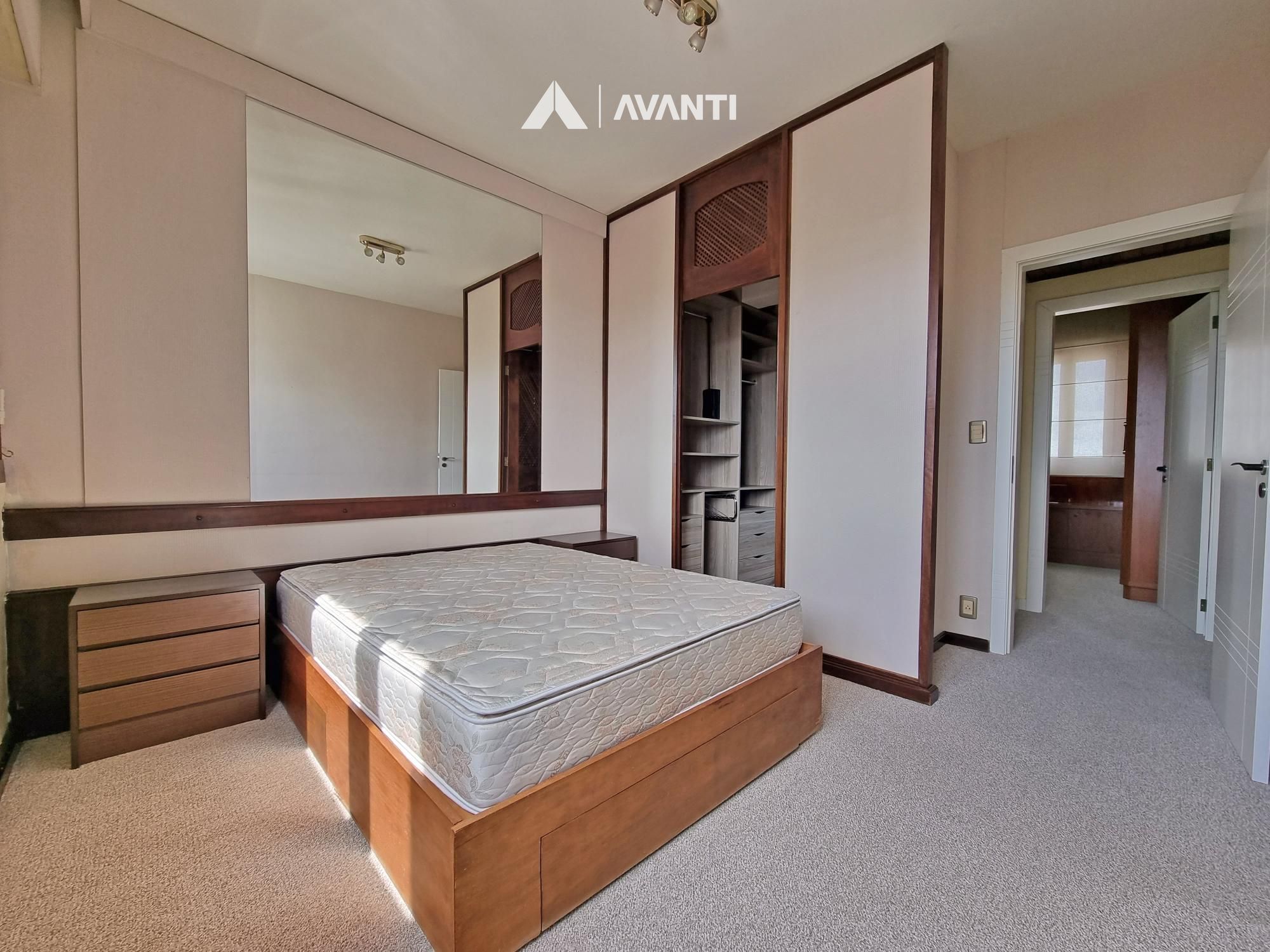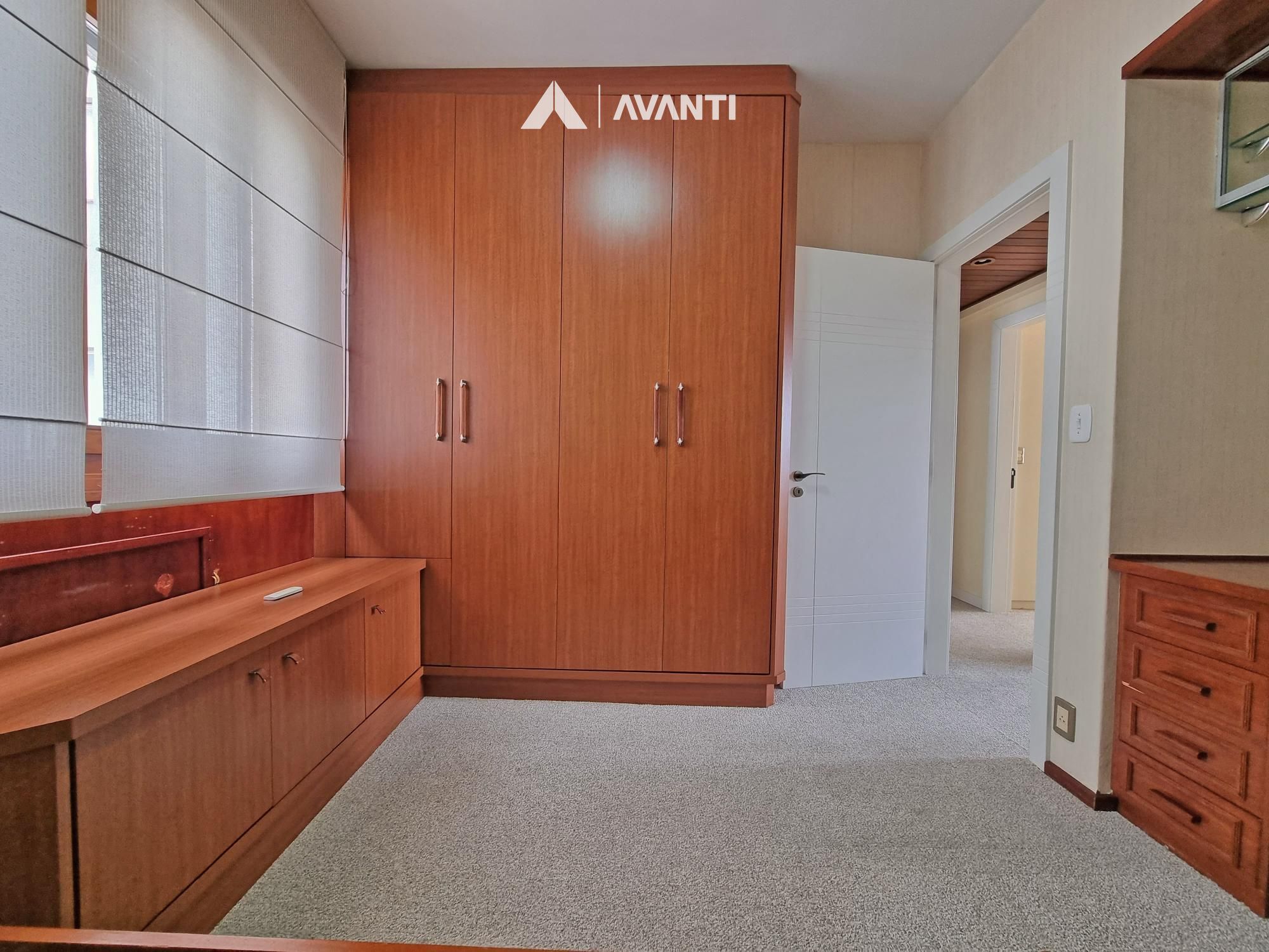 Conta com aberturas em PVC com vidros duplos, persianas automatizadas, piso laminado e carpete.